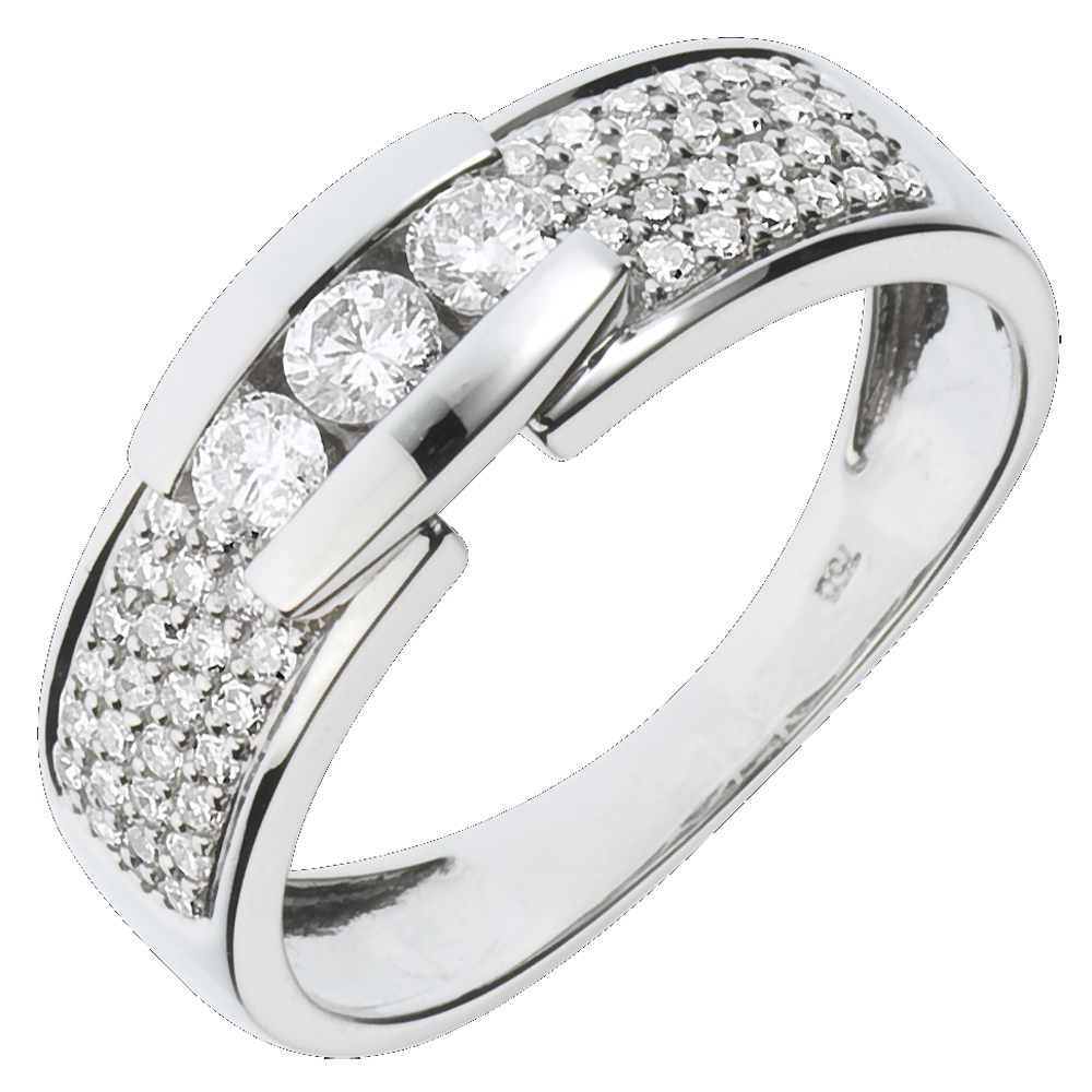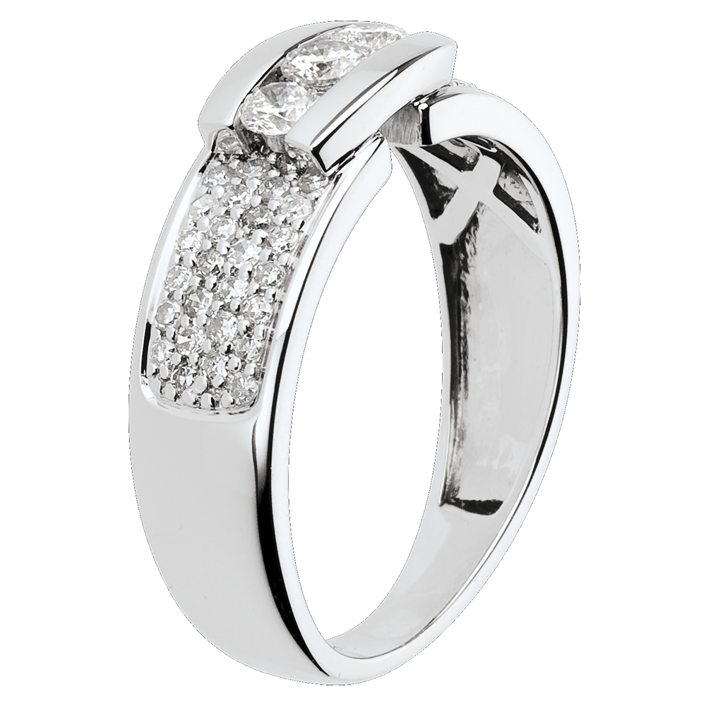Een diamanten trilogie gekoesterd en rijkelijk geplaveid op een witgouden frame.