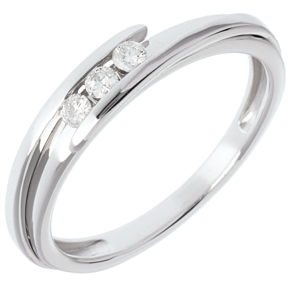 Een eenvoudig en klassiek frame gemarkeerd door een dubbele ring geopend op een diamanten trilogie.