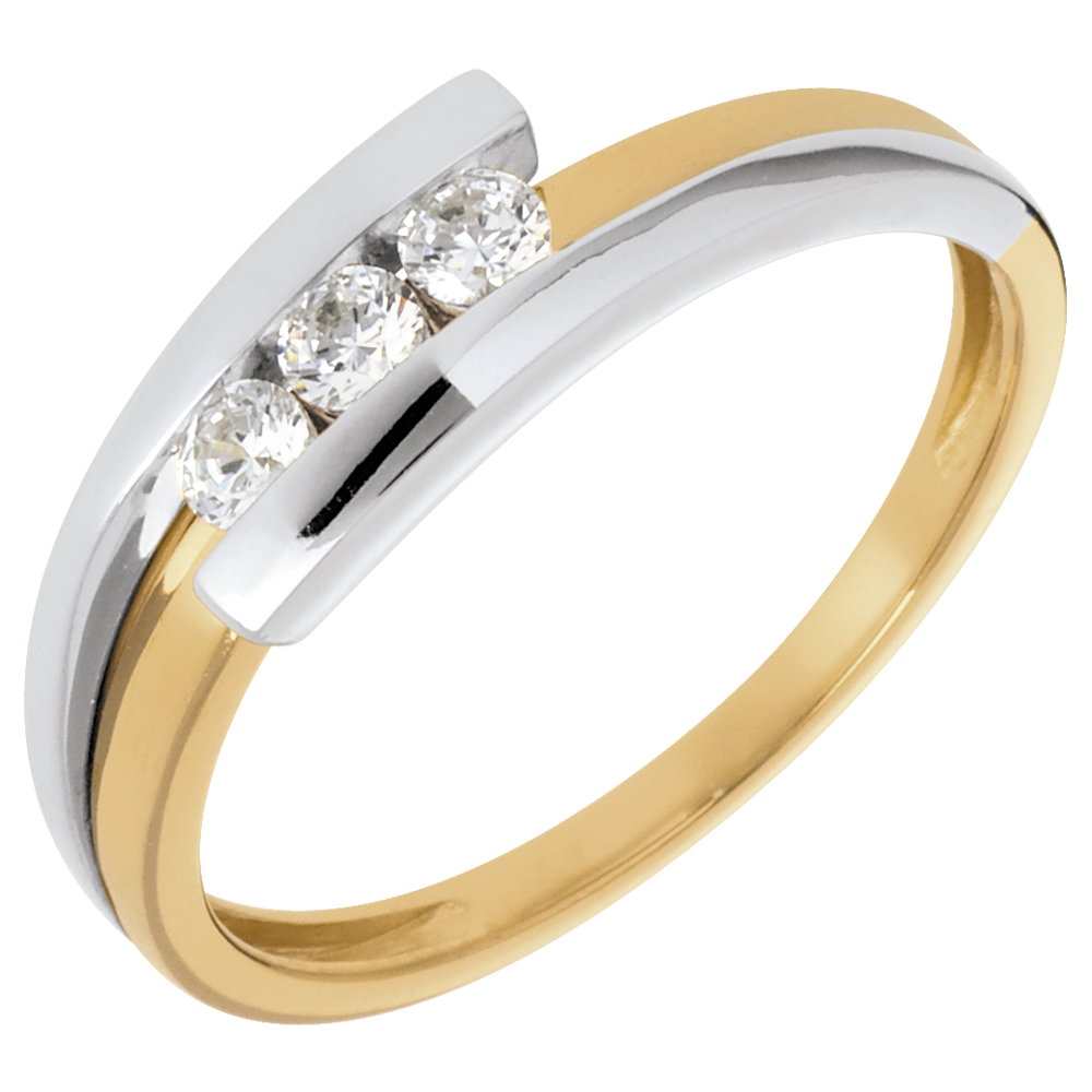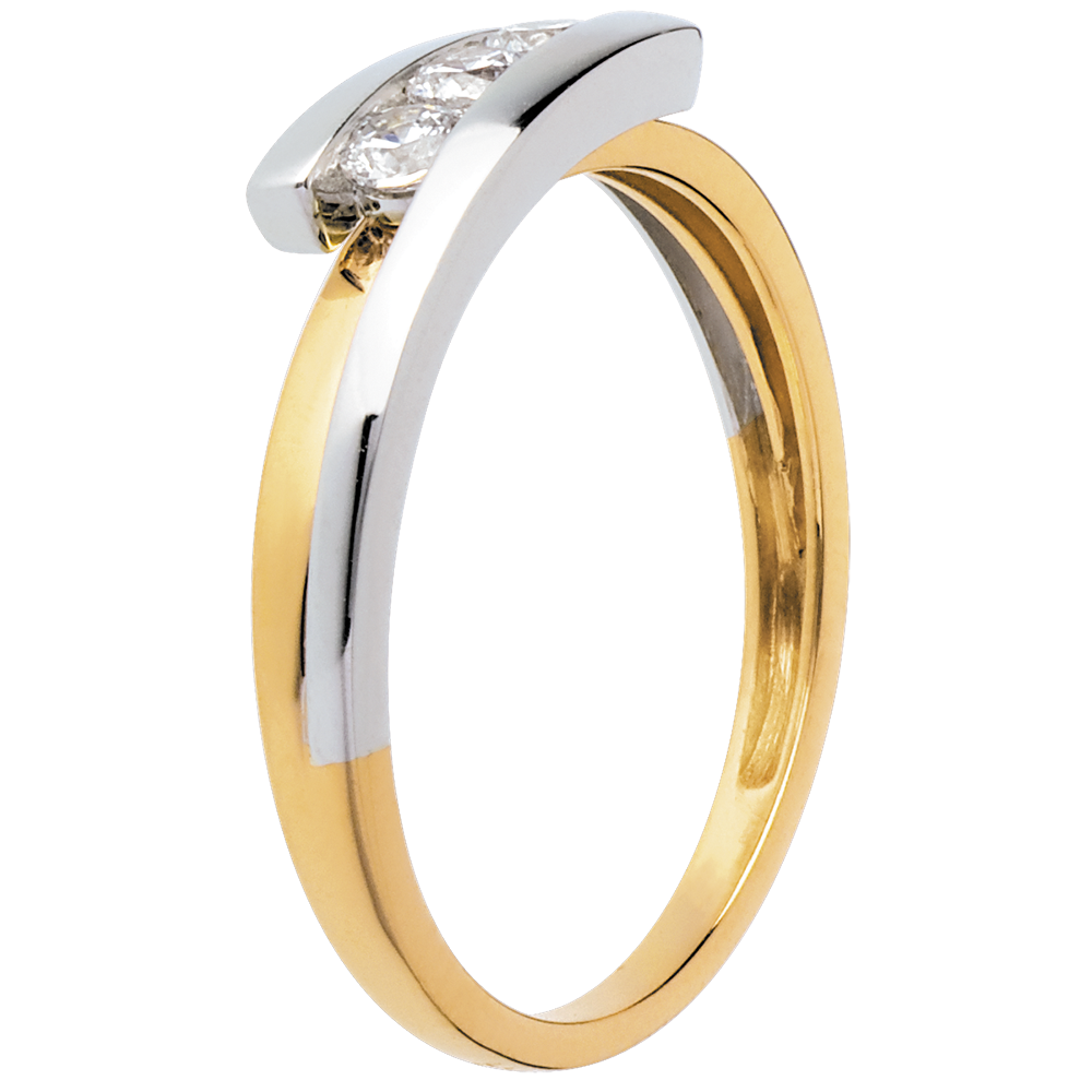 Een eenvoudig en klassiek frame banden met de kracht van een geelgoud en witgouden legering, om delicatesse te benadrukken met een diamanten trilogie.