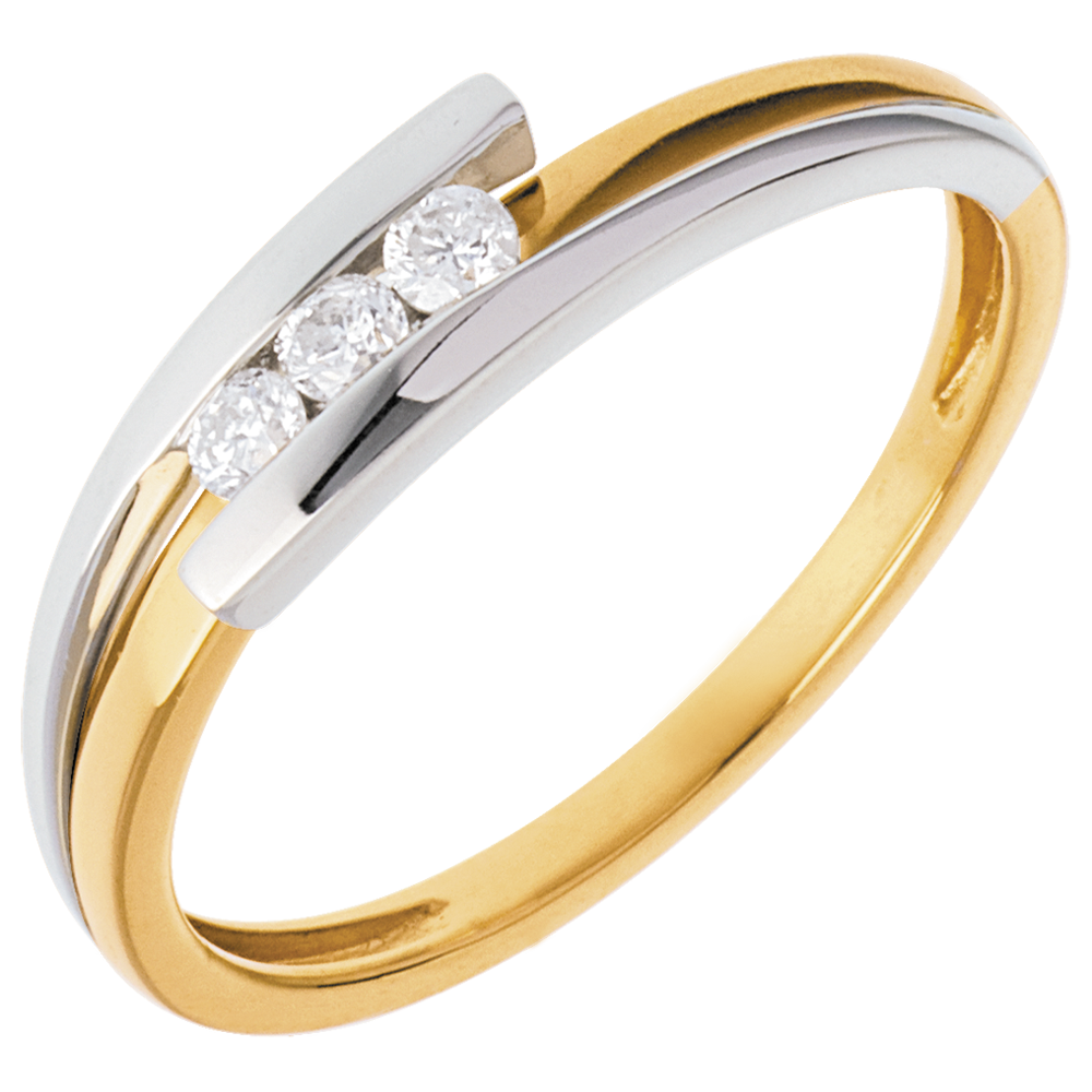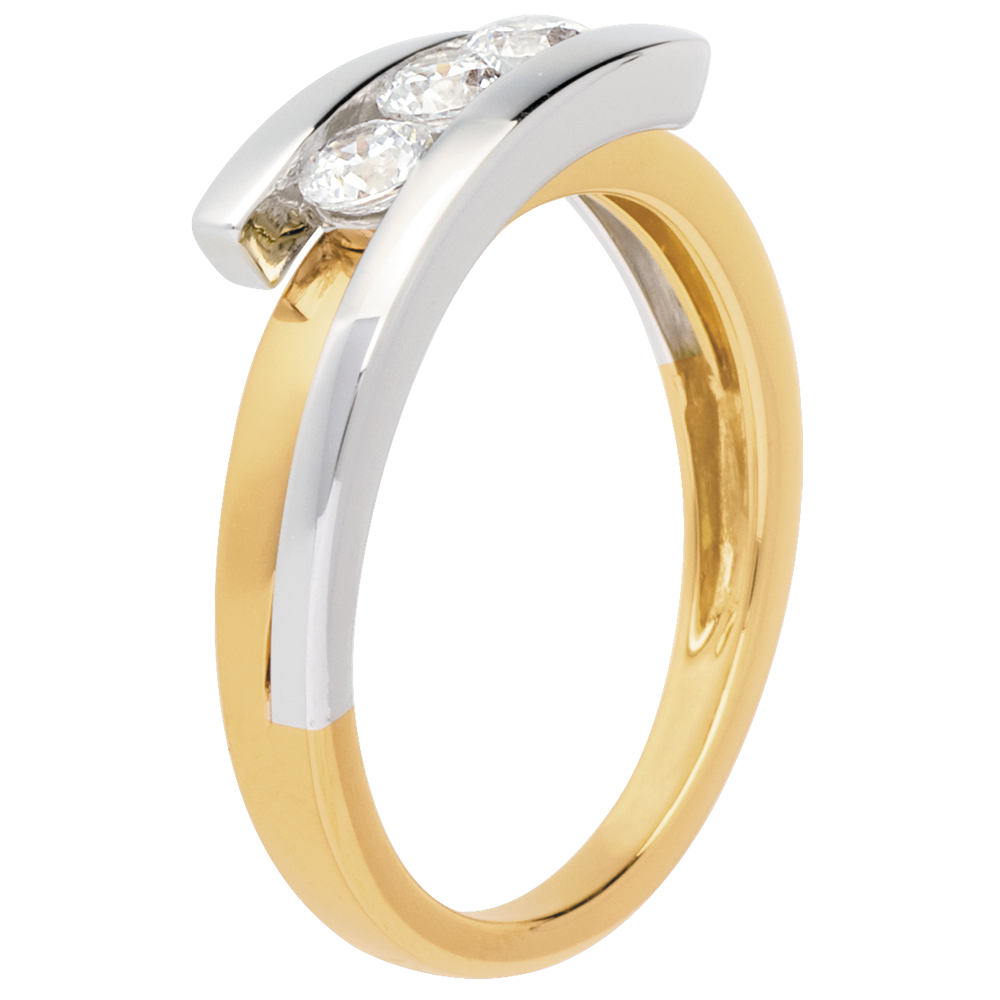 Een eenvoudig en klassiek frame banden met de kracht van een geelgouden en witgouden legering, om delicatesse te benadrukken met een diamanten trilogie.