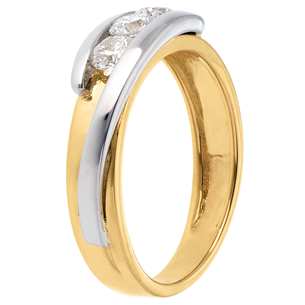 Een eenvoudig en klassiek frame banden met de kracht van een geelgouden en witgouden legering, om de delicatesse te benadrukken met een diamanten trilogie.