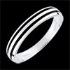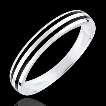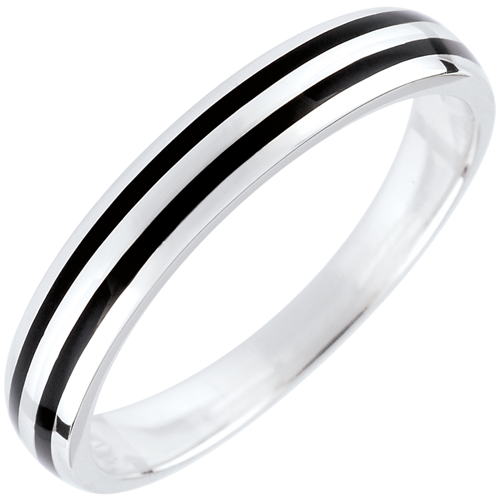 Een witgouden trouwring met een zwart gelakt lijntje, voor een mannelijk en modern design.