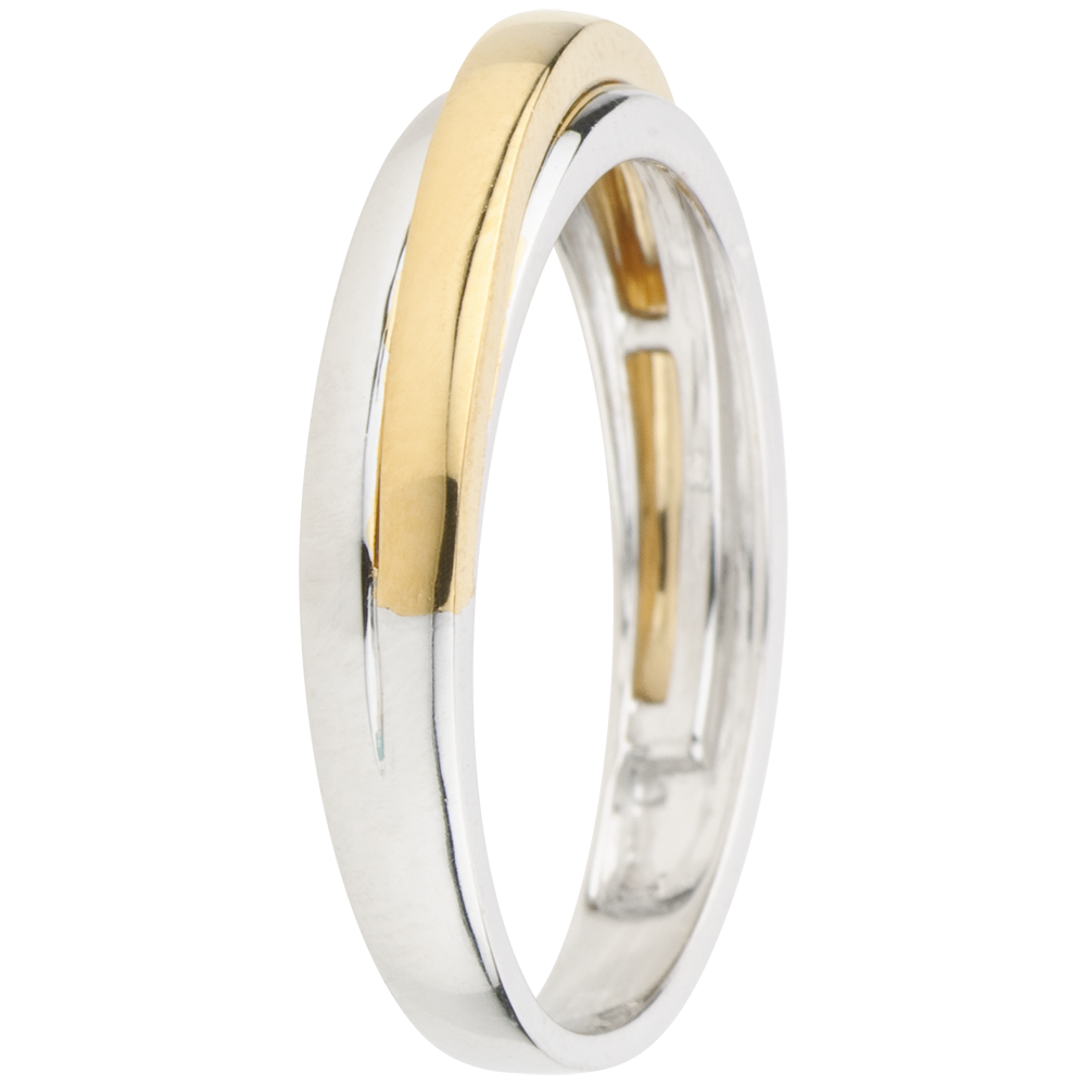 Een witgouden ring doorkruist met een gebogen gouden band voor een briljant en elegant dubbele ringen effect.