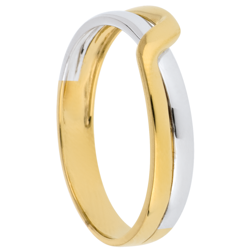 Een stralende geelgouden band aan een witgouden ring gevlochten.