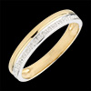 Een band van geelgoud met een gepaste wit gouden band die eruit ziet alsof die bedekt is met diamanten.