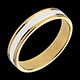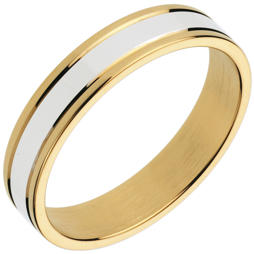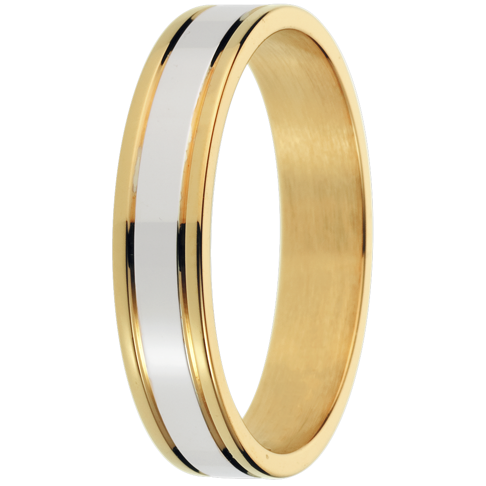 Een eenvoudige originele geelgouden trouwring, onderstreept door een witgouden rolbeugel in het midden.