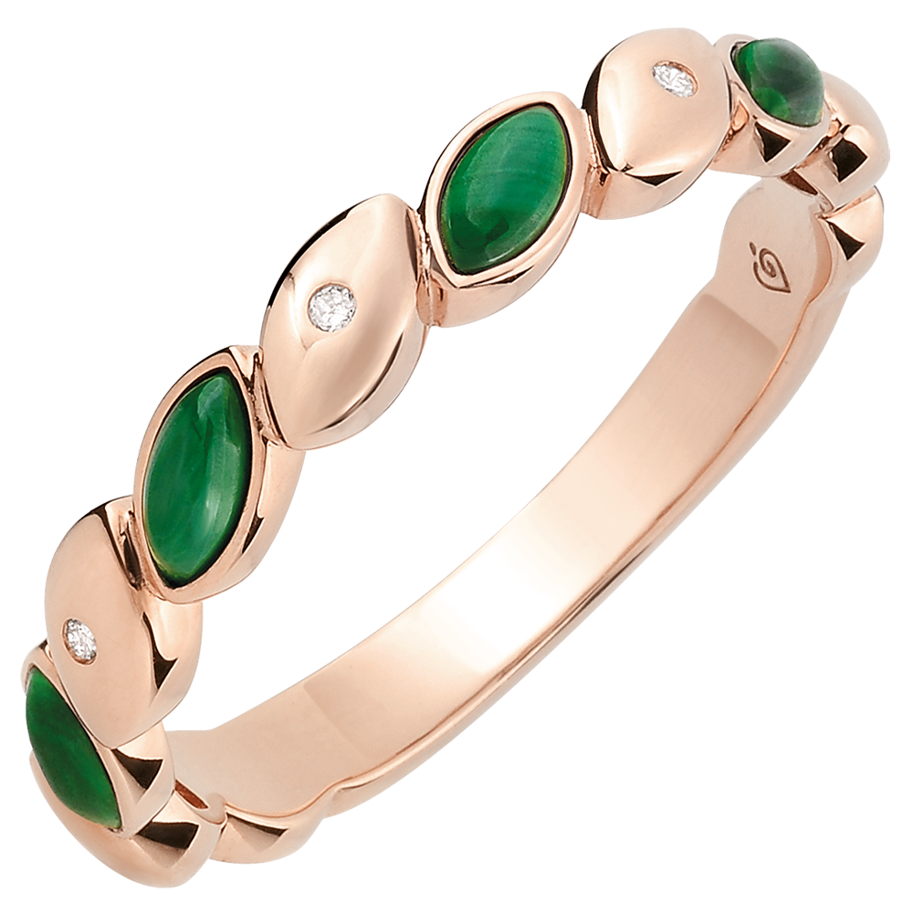 Een moderne trouwring in roségoud met dwarsspoeltjes die elkaar verfijnd afwisselen met malachiet en diamanten. Deze ring kan ook als gewone ring gedragen worden.
