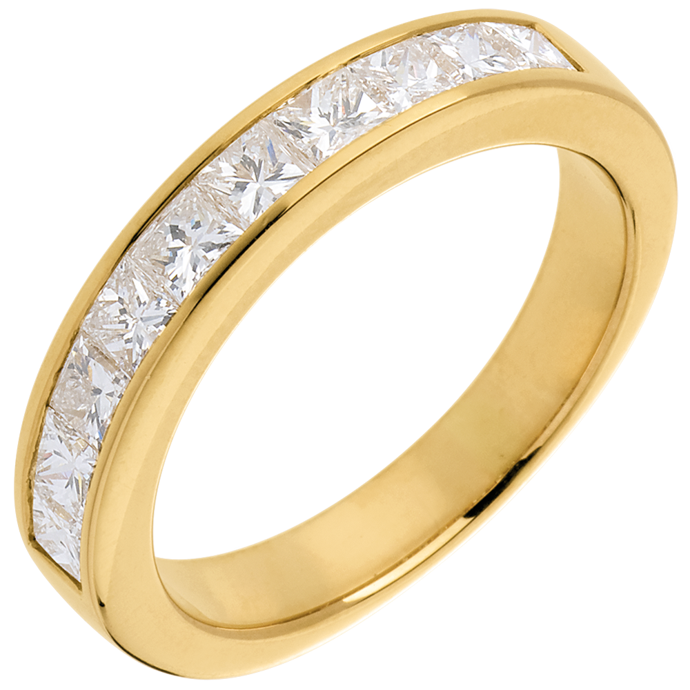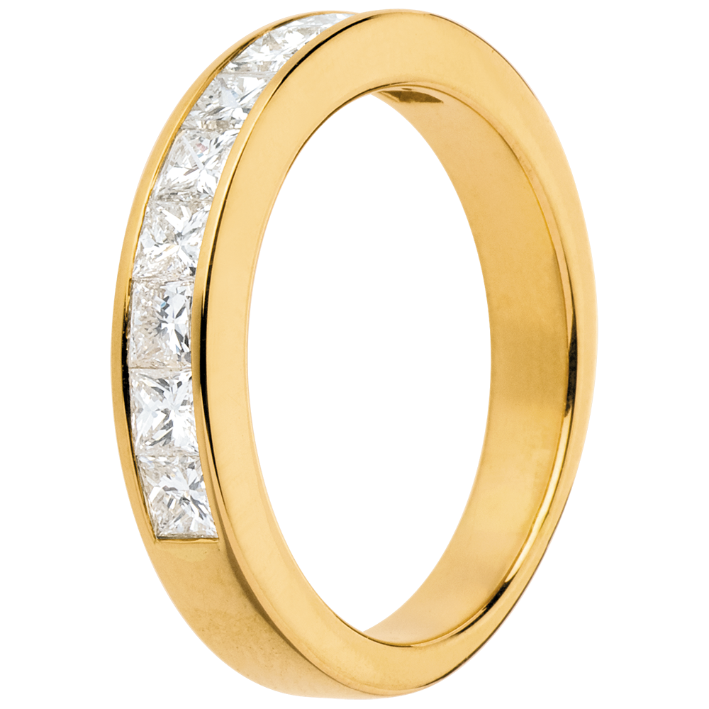 Een ring met vierkante doorsnede en halfronde pavézetting met geslepen diamanten.