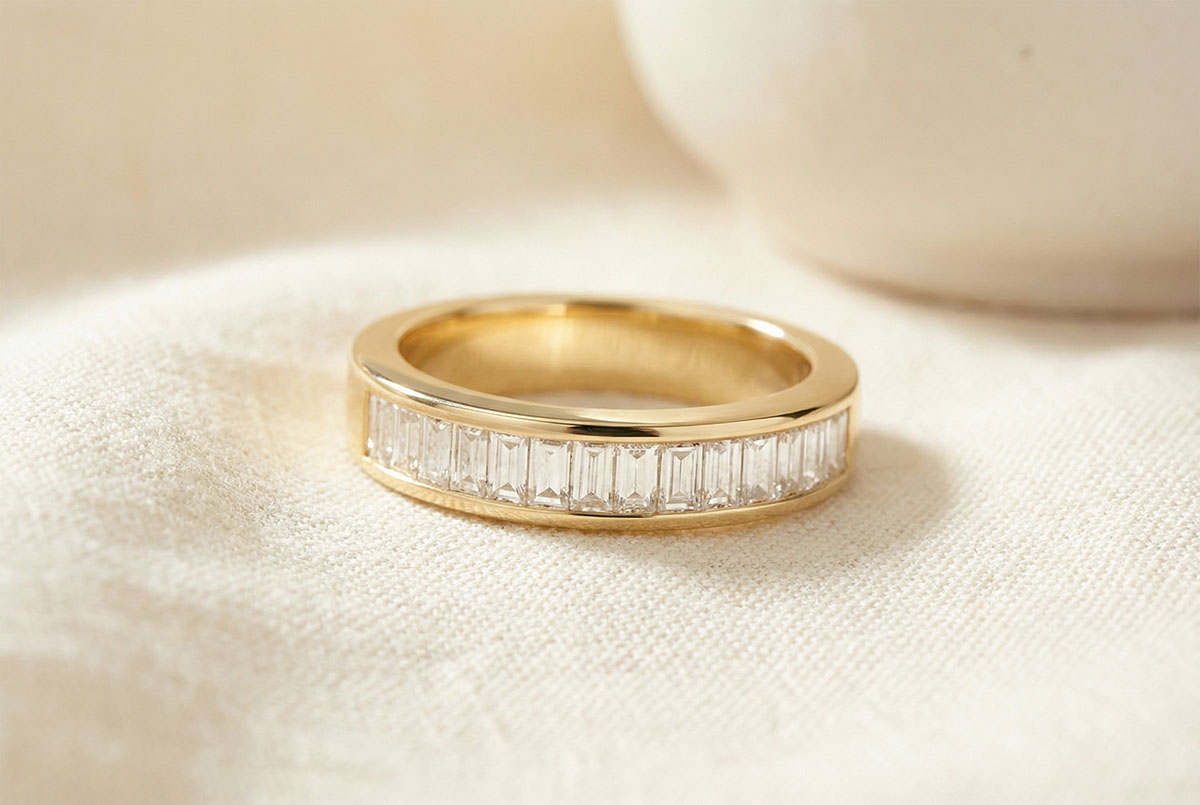 Een ring met vierkante doorsnede en halfronde pavézetting met geslepen diamanten.