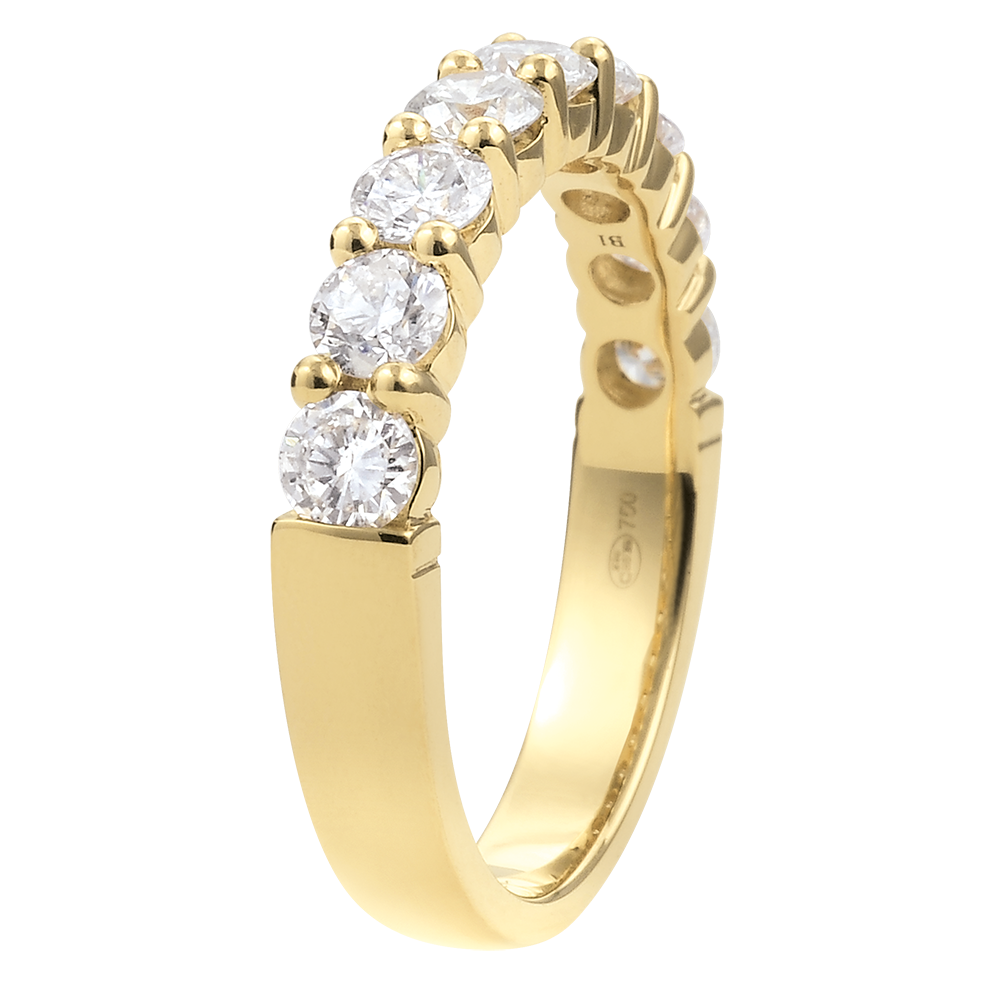 geelgouden ring bekroond met een pavézetting van 9 diamanten, geklauwd.