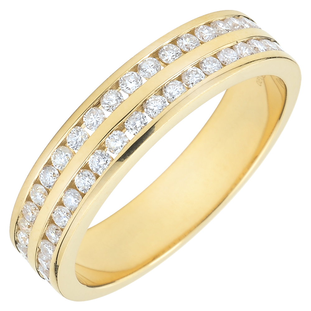 De perfecte balans tussen een geelgouden ring met 2 rijen van ronde diamanten voor een sterke symboliek. Een must juweeltje.…