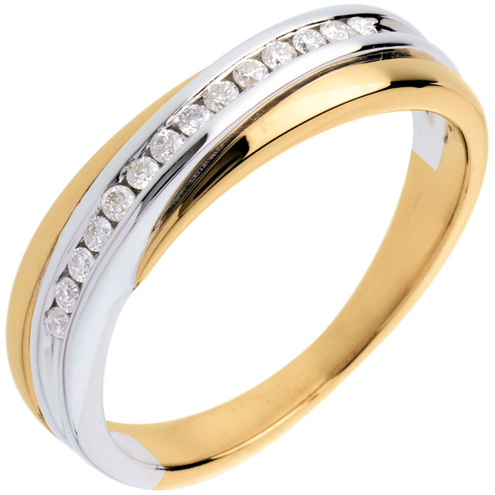 Een geelgouden trouwring met een witgouden ring er bovenop. Een evenwicht tussen vreugde en harmonie.