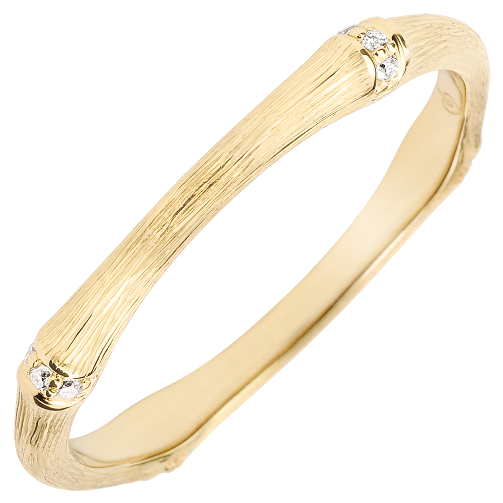 Een soepele en solide bamboetak geeft nu vorm aan een ring van geborsteld geelgoud, met diamanten bezet, voor een eeuwigdurend band. De afwerking met de hand van de matte afwerking geeft een natuurlijke uitstraling aan deze realistische uitvoering.