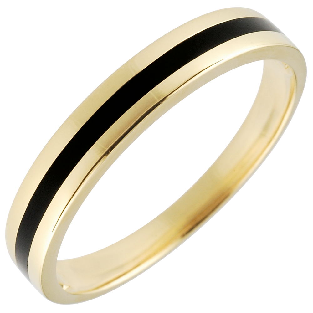 Een koepelvormige gouden ring wordt doorkruist door twee banden van zwarte lak voor een moderne en mannelijke trouwring.