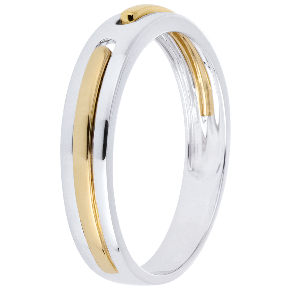 Twee lijnen van geelgoud zijn verenigd als een belofte van de eeuwigheid in een ring.