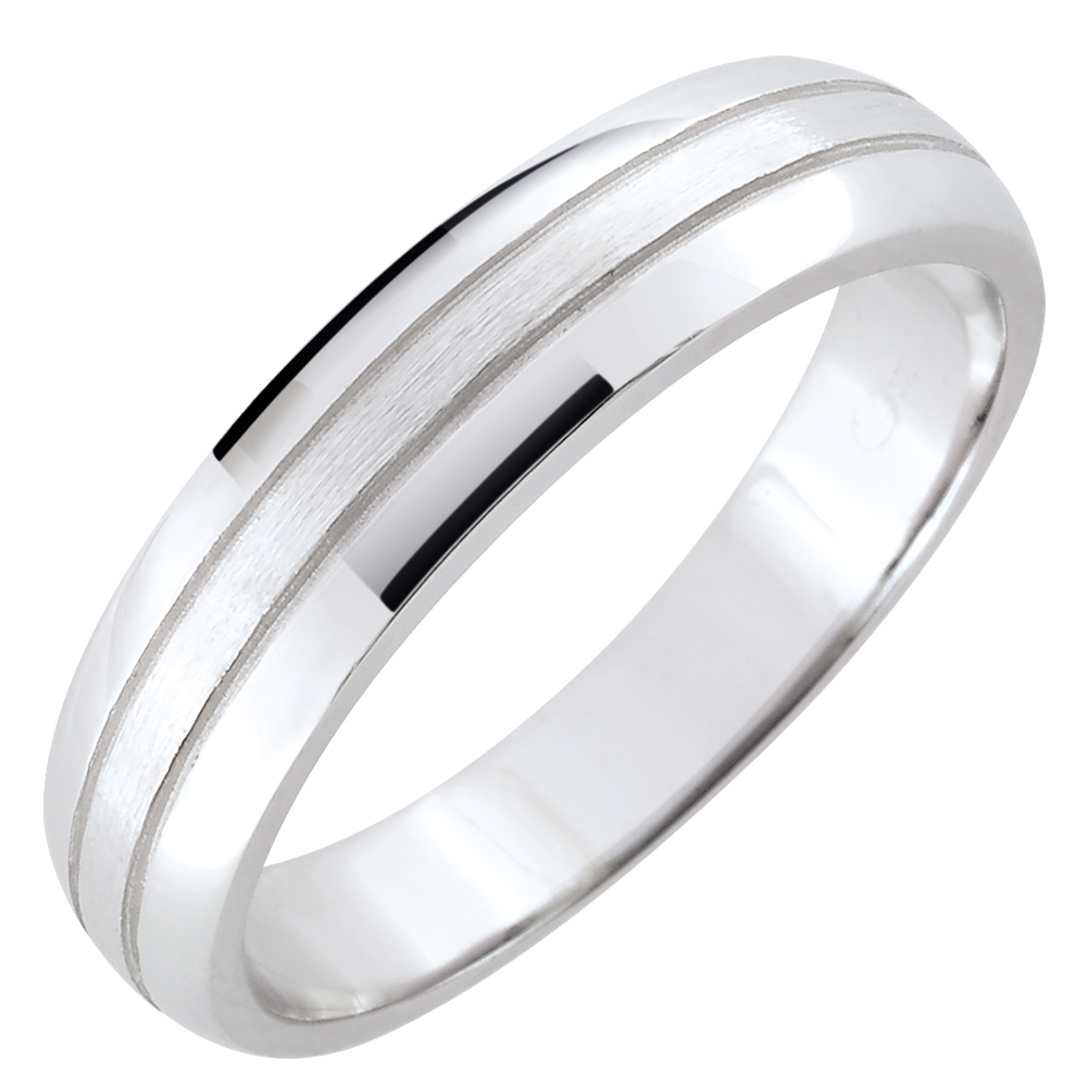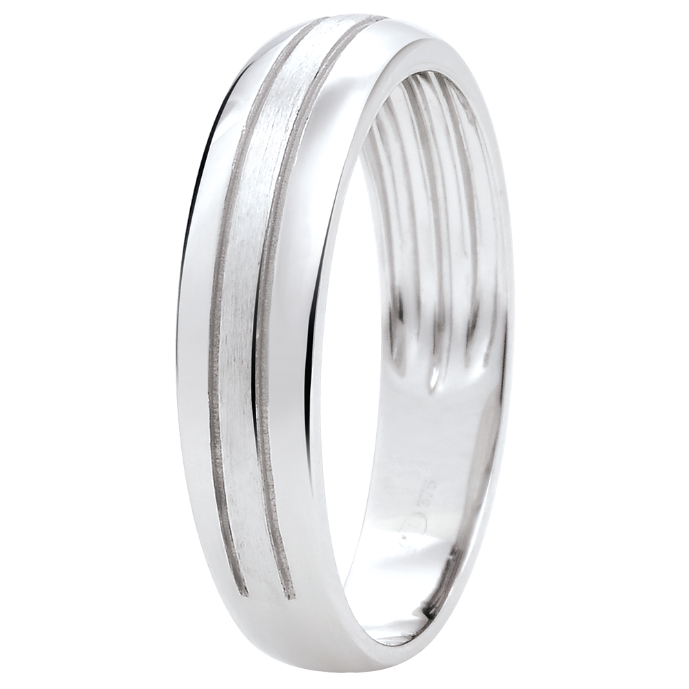 Een moderne trouwring, discreet en mannelijk met geborsteld witgoud voor een vleugje originaliteit