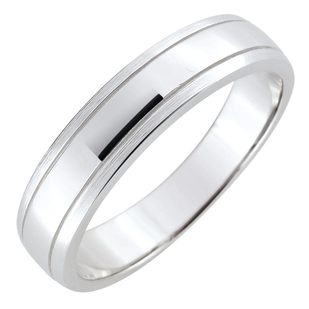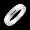 Een trouwring in geborsteld witgoud is versierd met een horizontale band in glanzend goud. Deze trouwring voor heren in witgoud is een klassieker revisited.