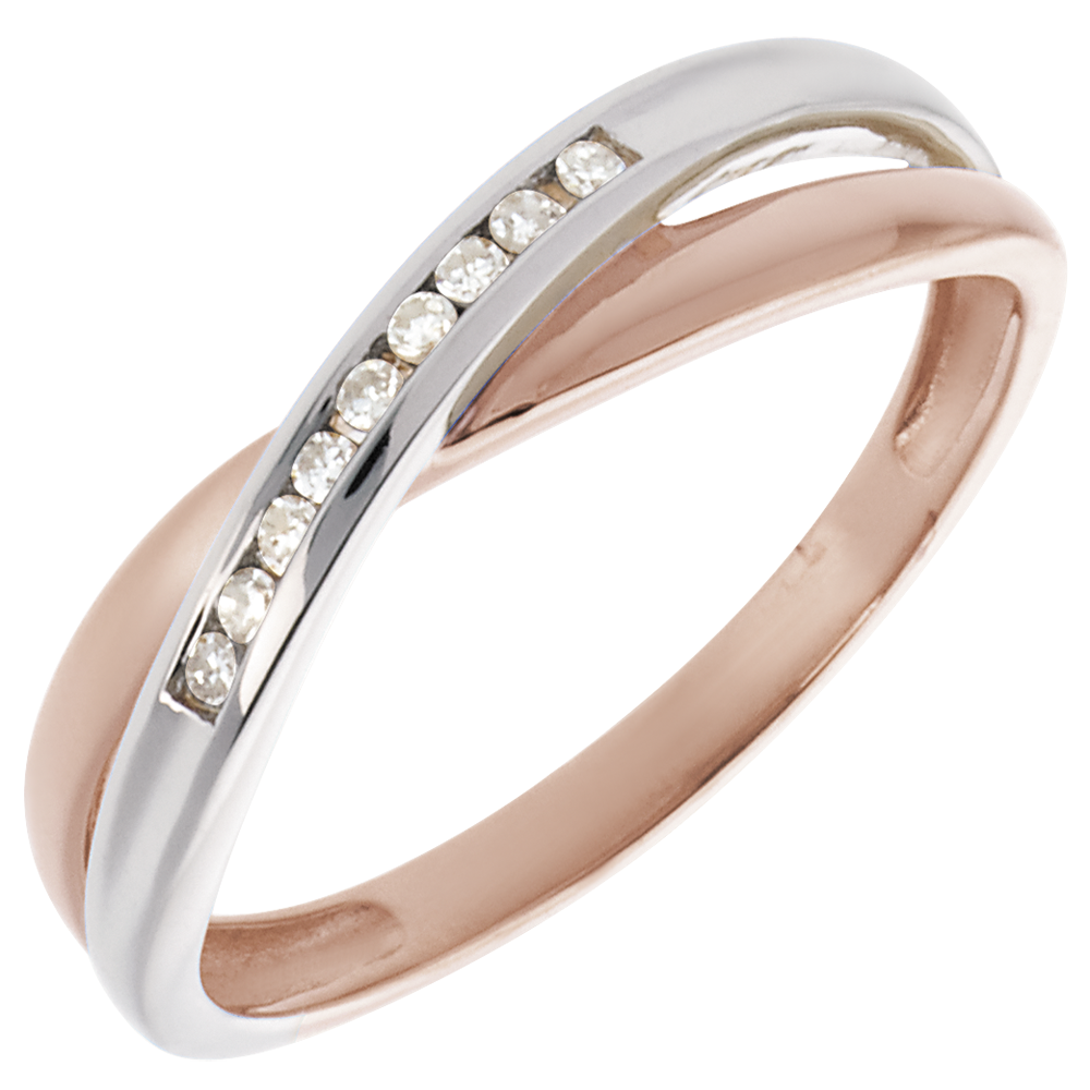 Een roségouden ring doorsnijdt een witgouden ring bezet met diamanten voor een strakke en moderne trouwring.