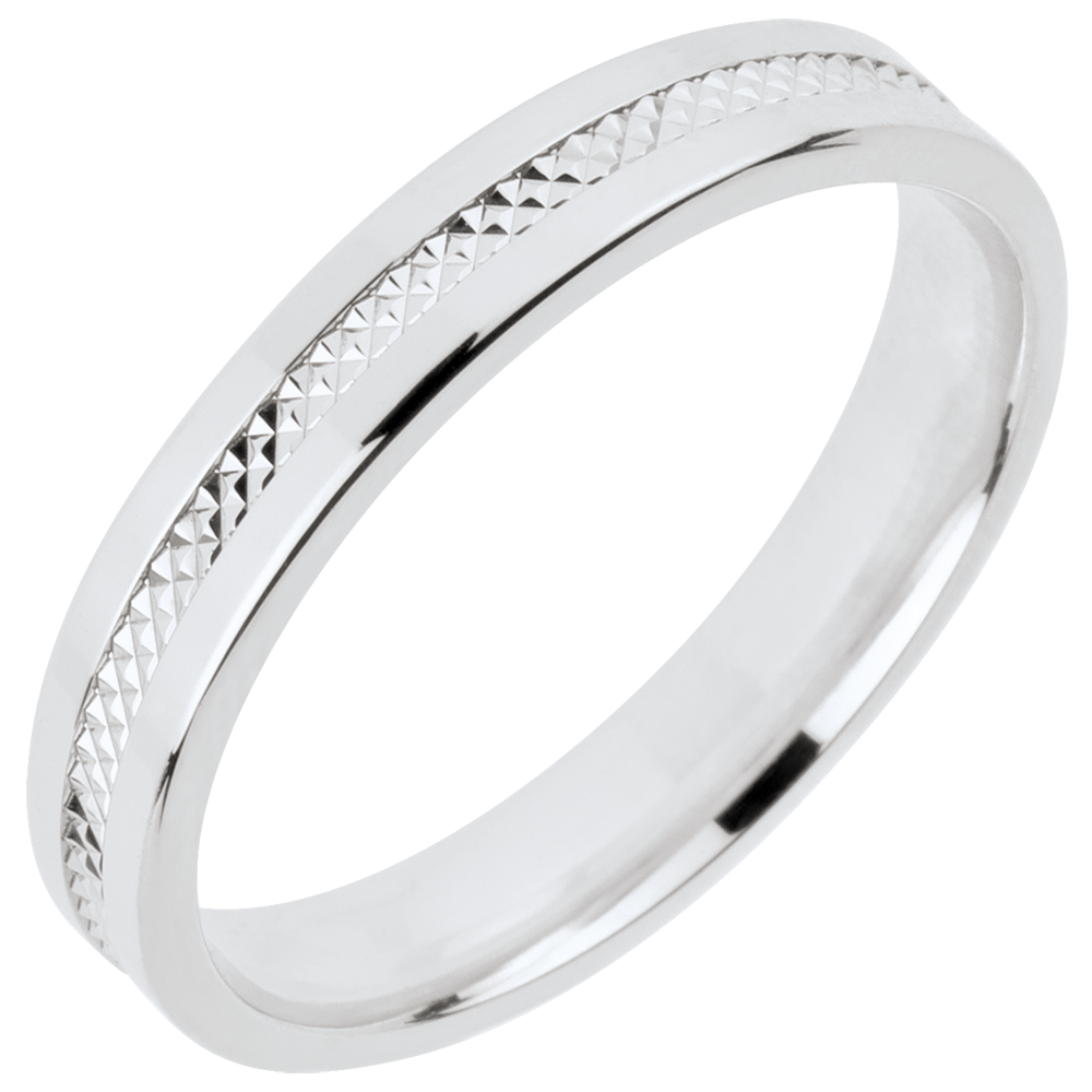 Een witgouden trouwring met een patroon erop gegraveerd, geven hem een maximum helderheid.