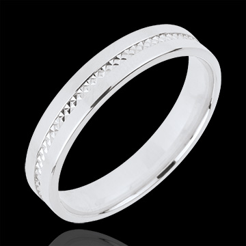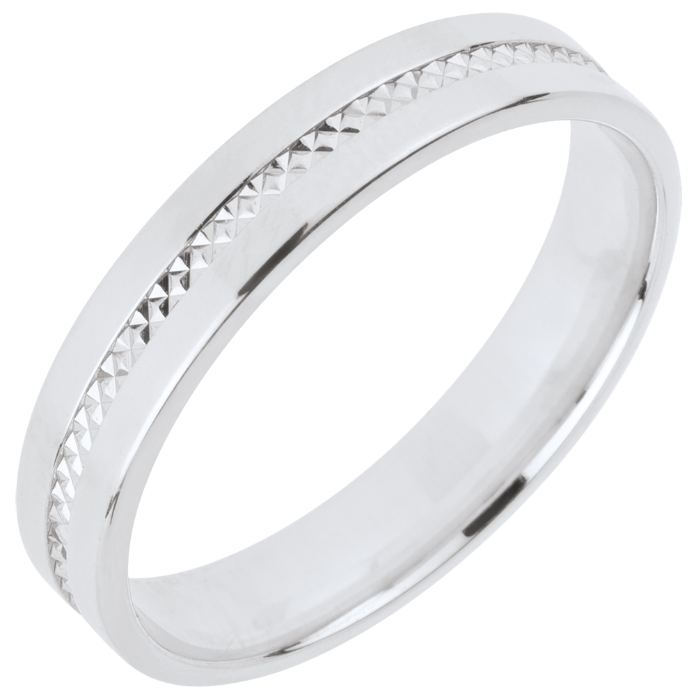 Een witgouden trouwring met een patroon erop gegraveerd, geven hem een maximum helderheid.