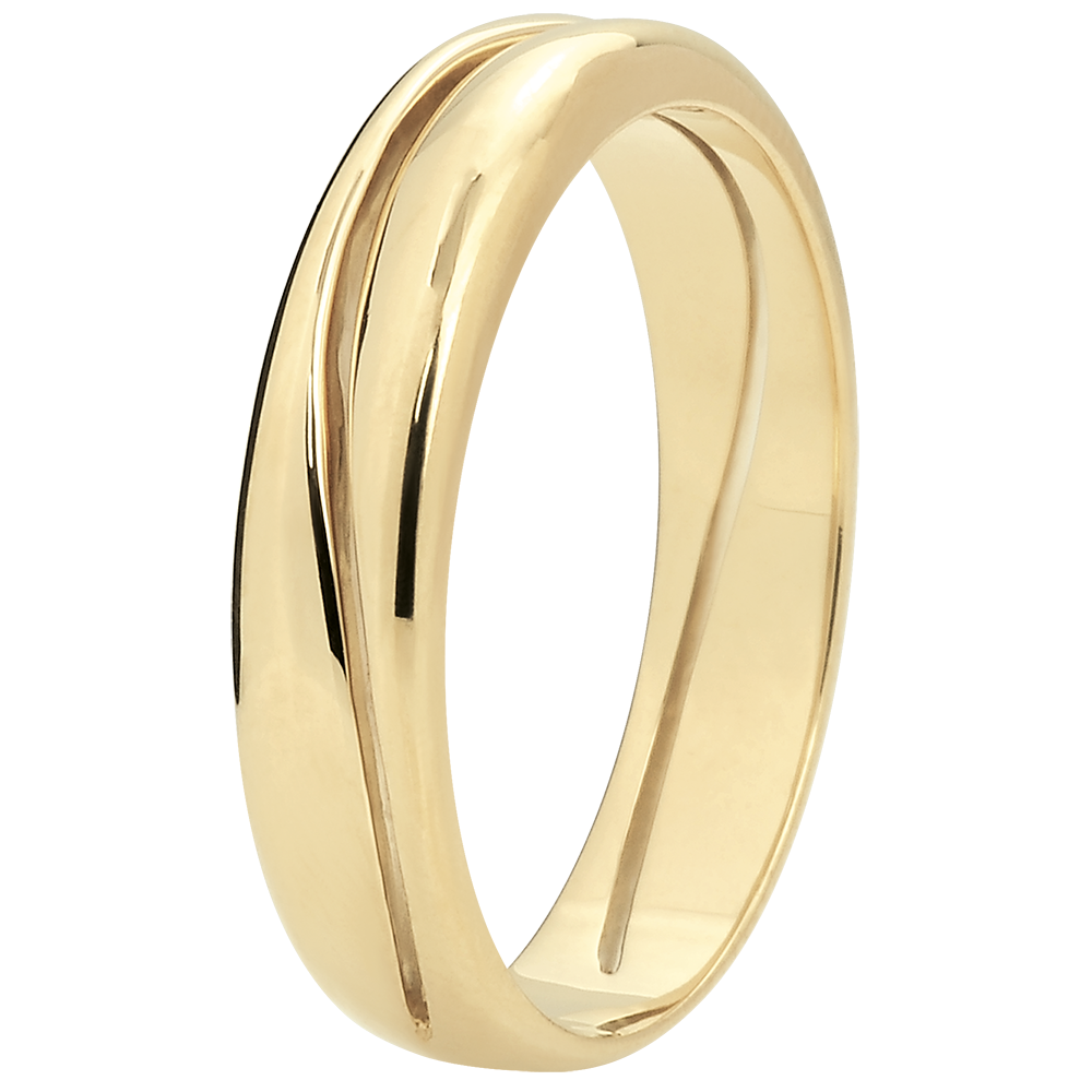 Een brede geelgouden ring doorkruist door een golf die de ring in twee delen deelt.