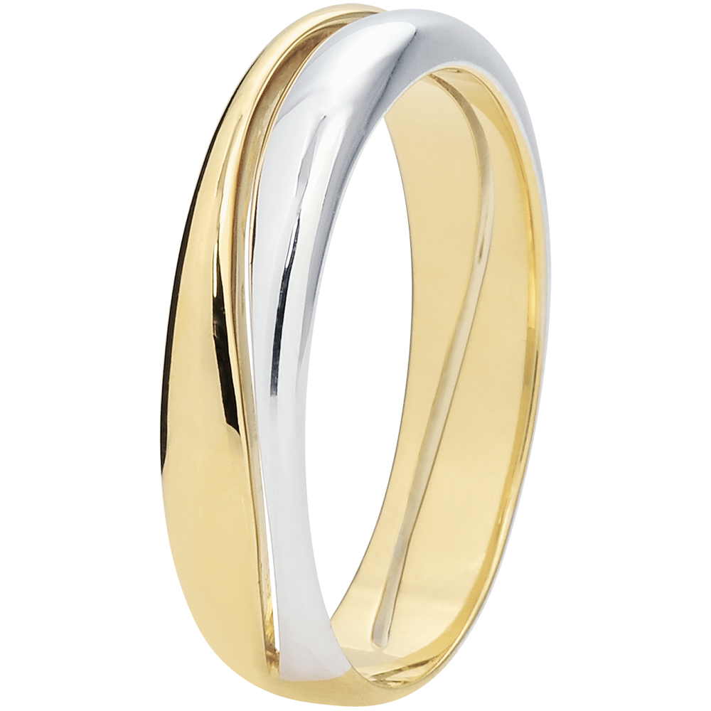Een brede gouden ring doorkruist door een golf die de ring in twee delen deelt. Trouwring 2 goudsoorten