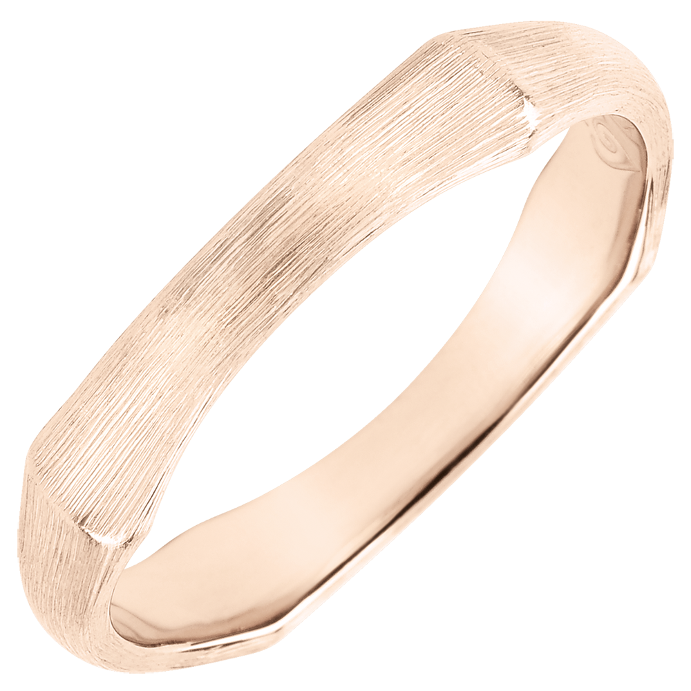 Een soepele en solide bamboetak geeft nu vorm aan een ring van geborsteld roségoud voor een eeuwigdurend band. De afwerking met de hand van de matte afwerking geeft een natuurlijke uitstraling aan deze realistische uitvoering.
