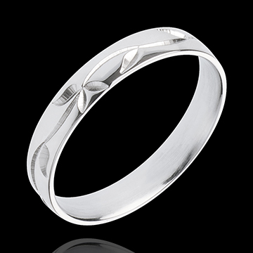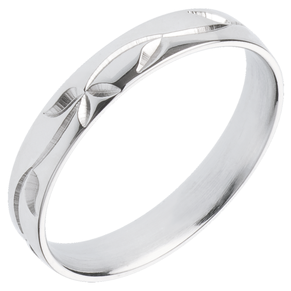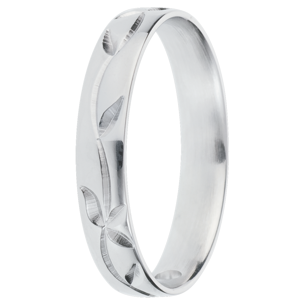 Een witgouden trouwring met mooie bladeren erop gegraveerd.