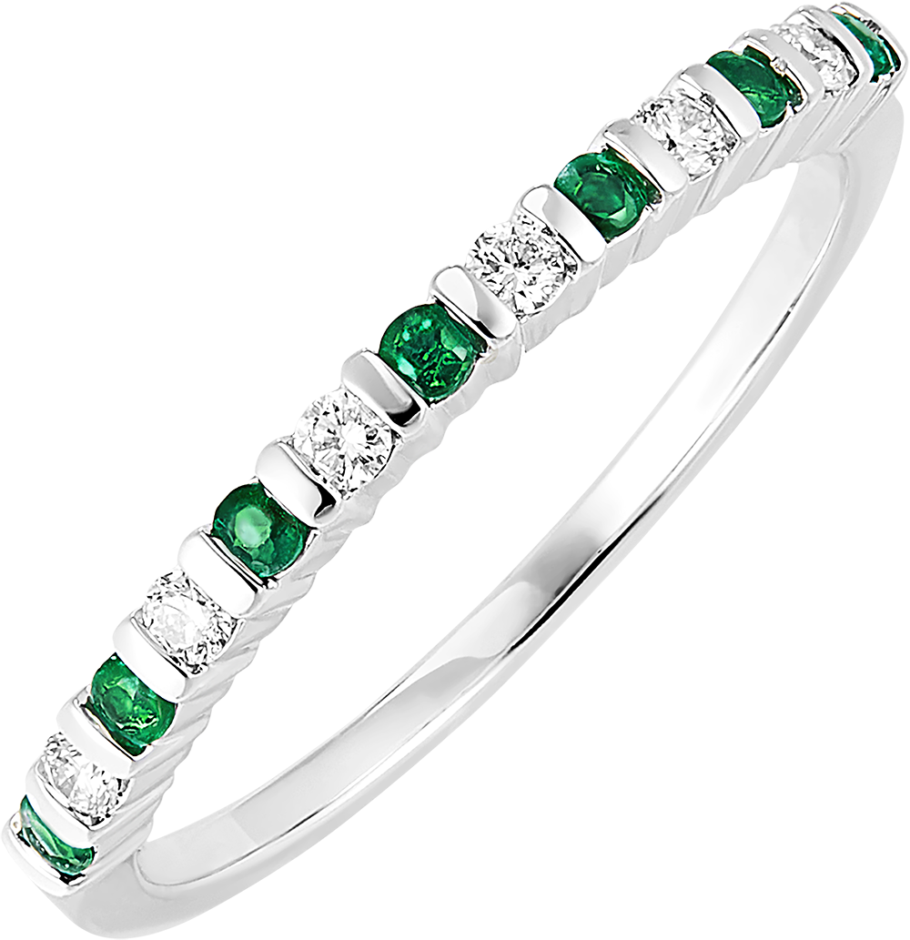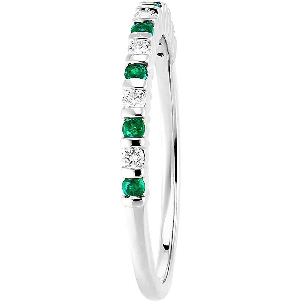 Een witgouden ring bezet met smaragden en diamanten in een afwisselend patroon. Een klassiek maar tijdloos sieraad met een kleurrijke touch.