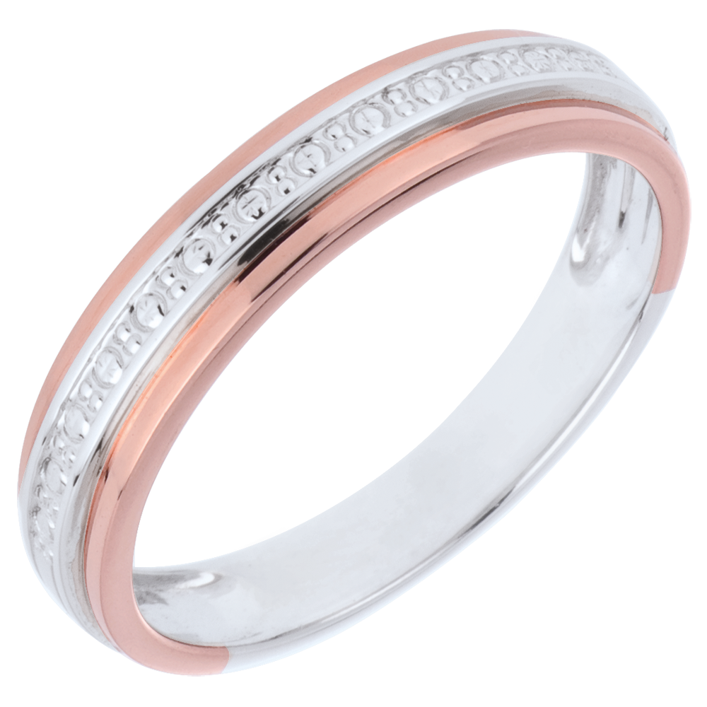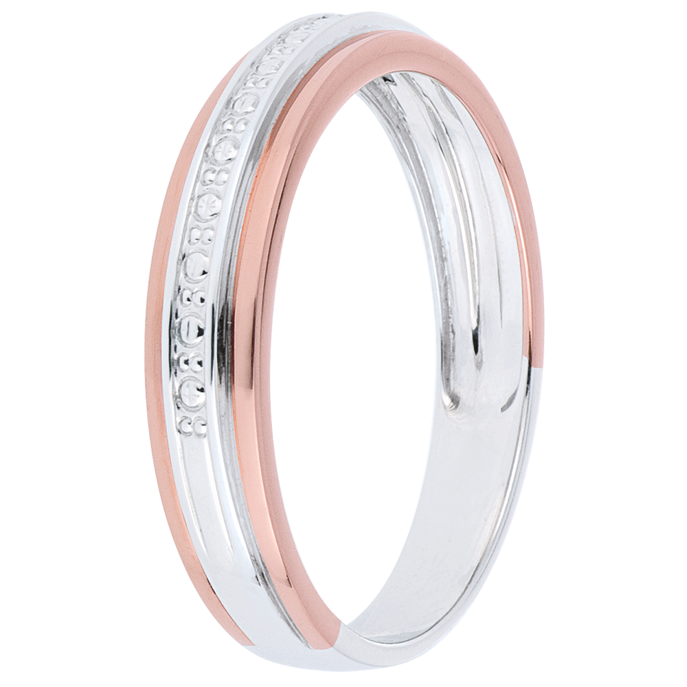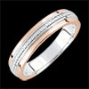 Een witgouden band met een sculptuur die diamanten imiteert, wordt omlijst door twee roségouden lijnen. Een elegante en moderne trouwring