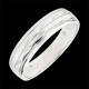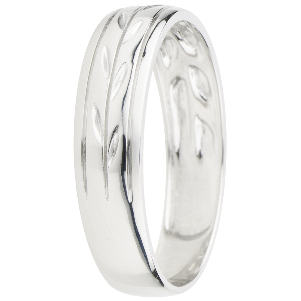 Een brede trouwring in witgoud gegraveerd met eeuwig gebladerte.