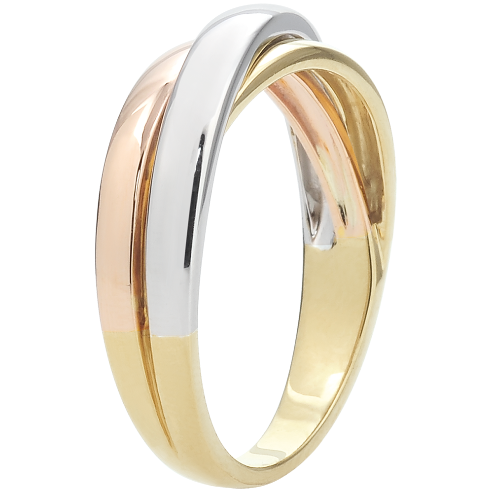 Een klaverblad ring in 3 goudkleuren gevlochten en verzameld voor een trouwring in beweging en finesse. Een trouwring voor heren en dames.