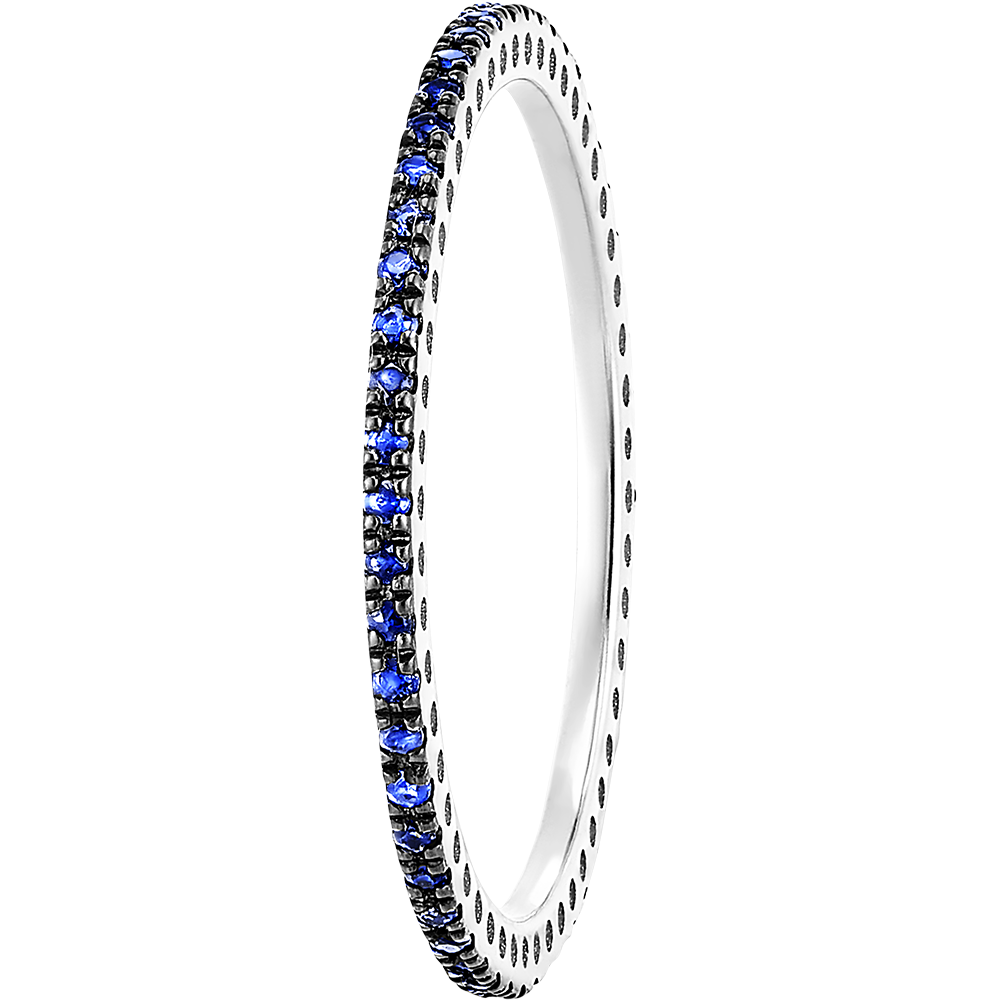 De slanke vorm en de volledige saffierzetting symboliseren een subtiele en stralende verbintenis.