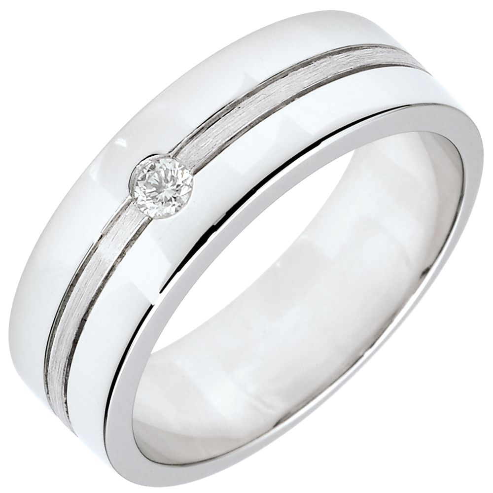 Een brede trouwring van witgoud is versierd met een centrale diamant en doorkruist door een band met geborsteld goud.