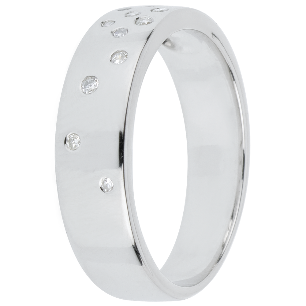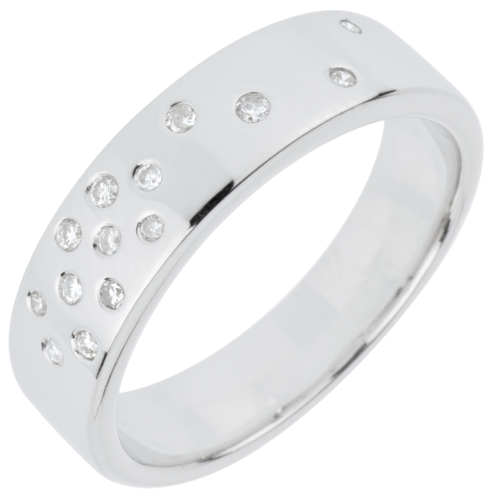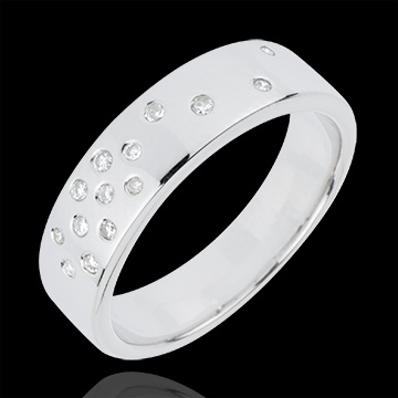 Een witgouden trouwring met diamanten, verspreid als sterren aan de hemel.