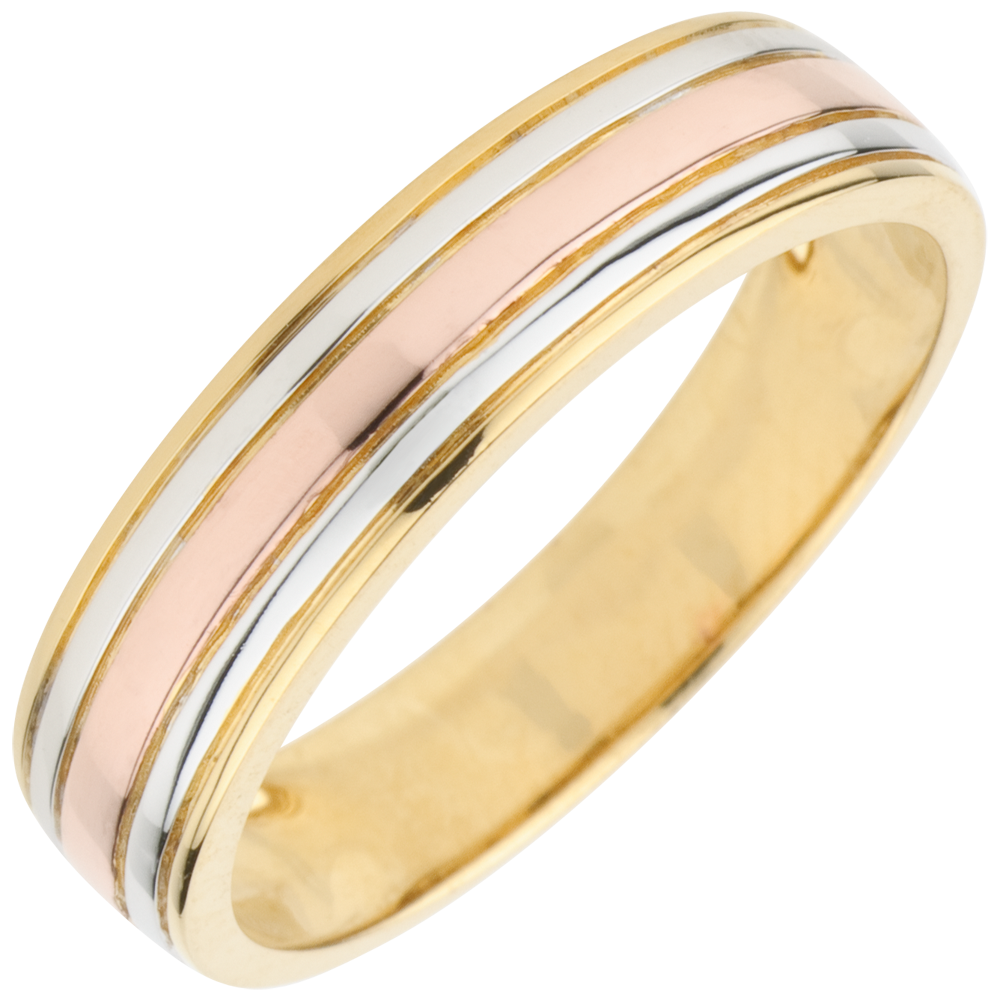 De fijnheid van goud opgestapeld voor een sterke en gelouterde trouwring in drie goudsoorten.