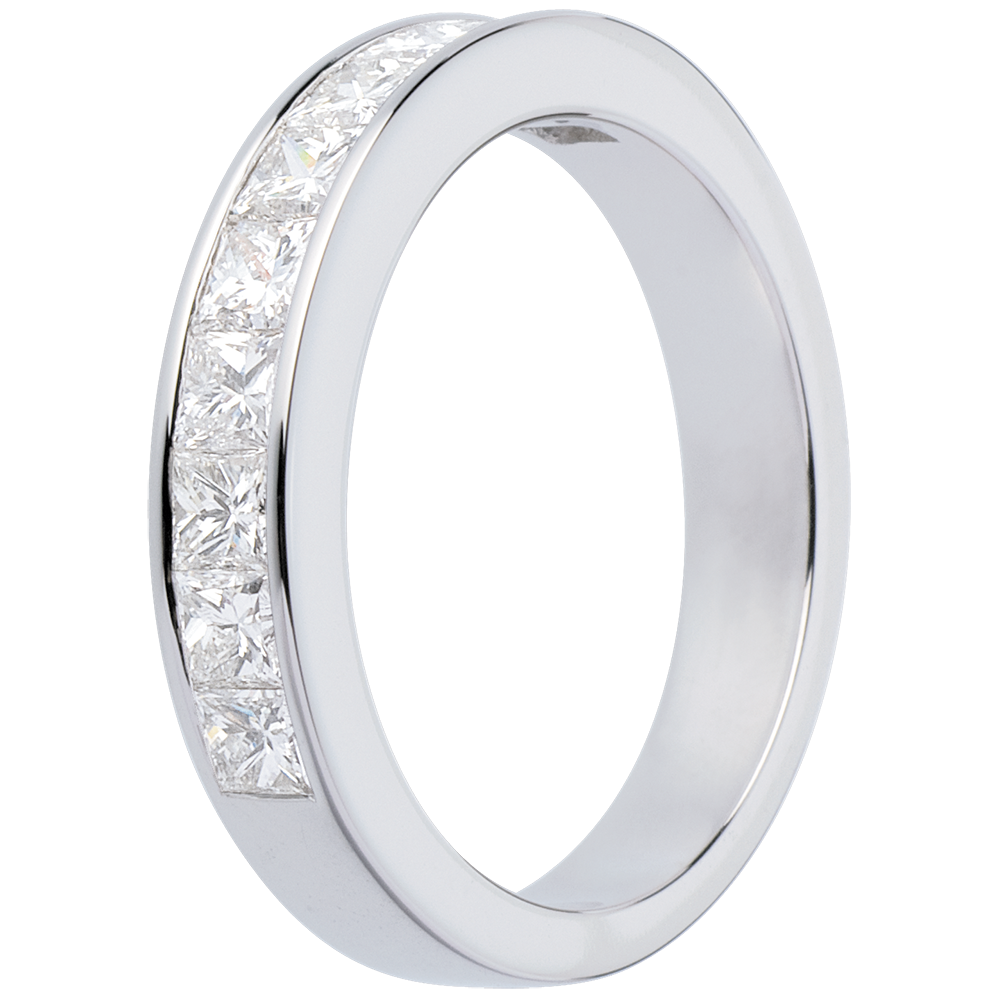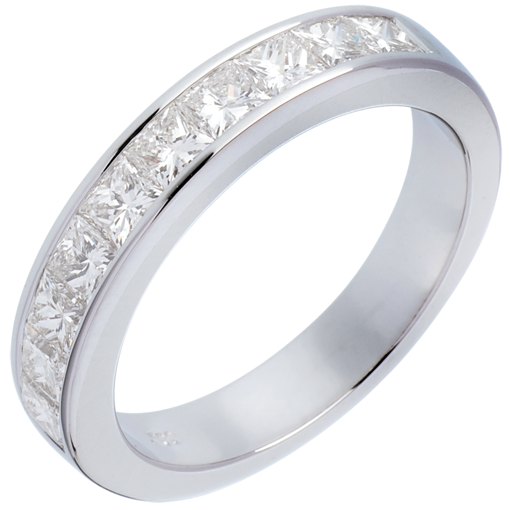 Een ring met vierkante doorsnede en halfronde pavézetting met geslepen diamanten.