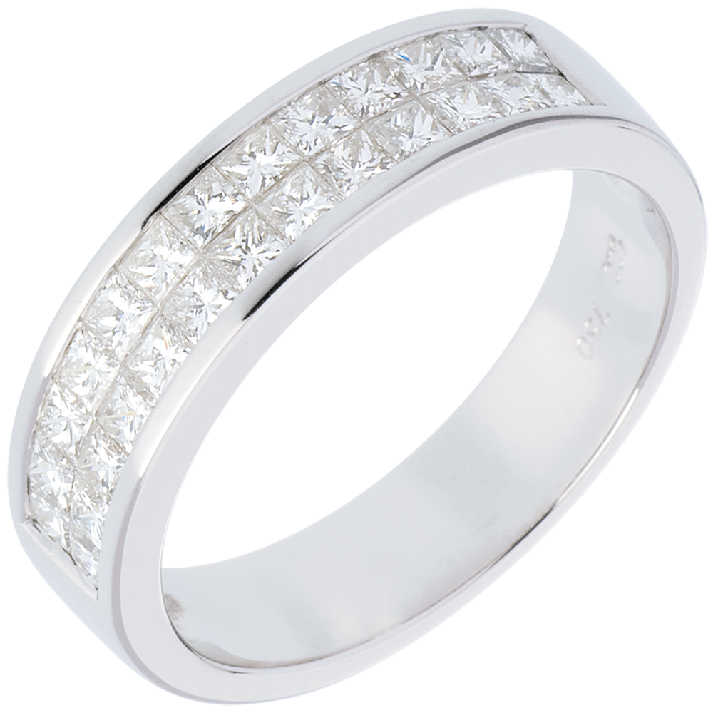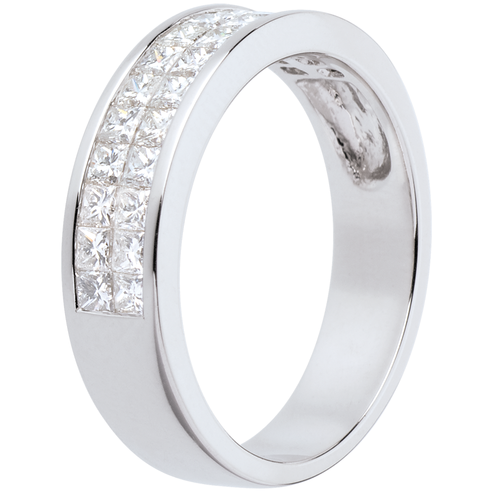 Een ring met vierkante doorsnede en halfronde pavézetting met geslepen diamanten.