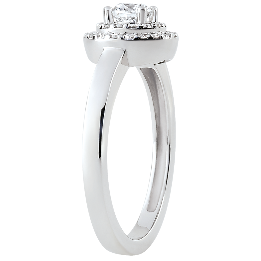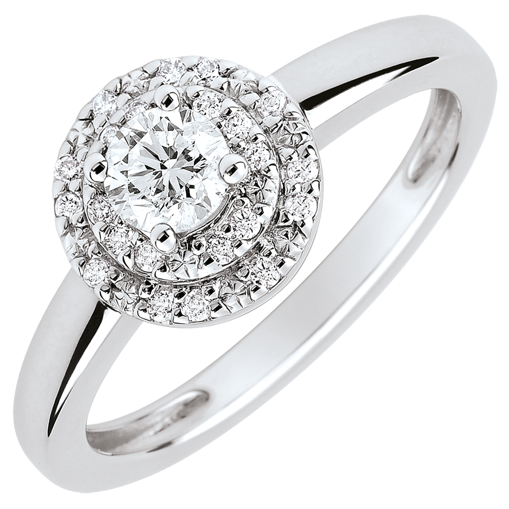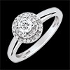 Deze verlovingsring, met een tijdloze elegantie, fascineert door het accent te leggen op een diamant met de afmetingen van een briljant,die omringd is door een dubbele rij diamanten. Luxe en romantiek voor deze omringde solitaire.