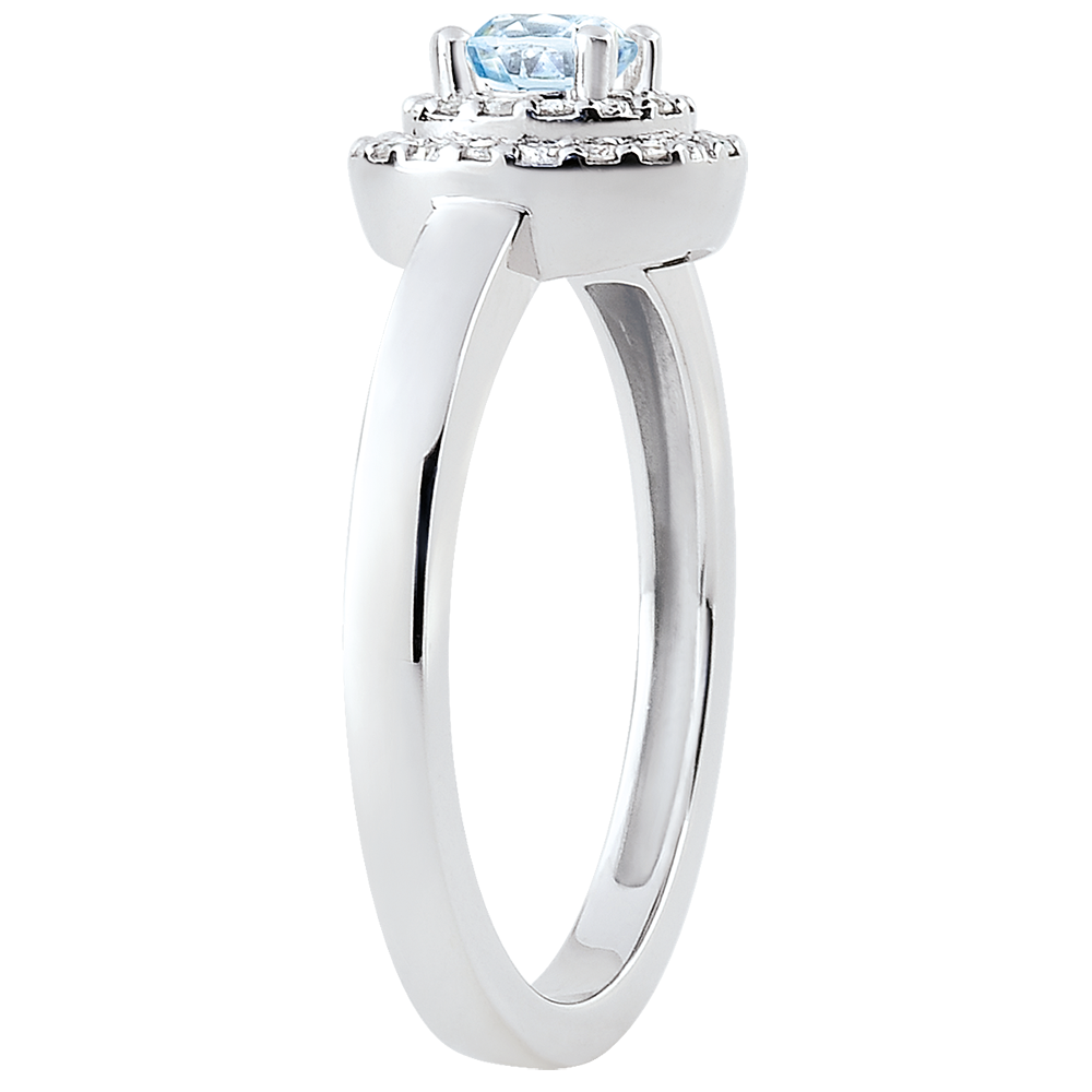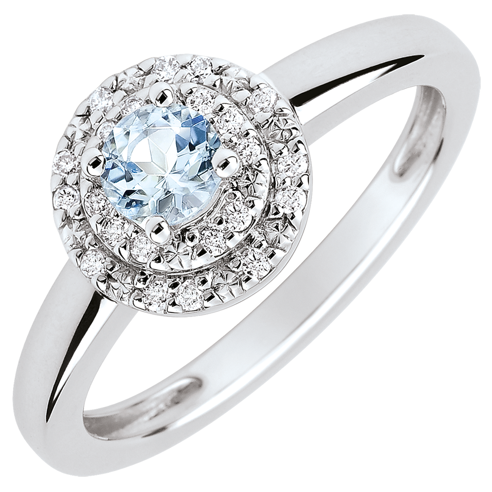 Deze verlovingsring, met een tijdloze elegantie, fascineert door het accent te leggen op een aquamarijn die omringd is door een dubbele rij diamanten. Verwondering en romantiek voor deze omringde solitaire.