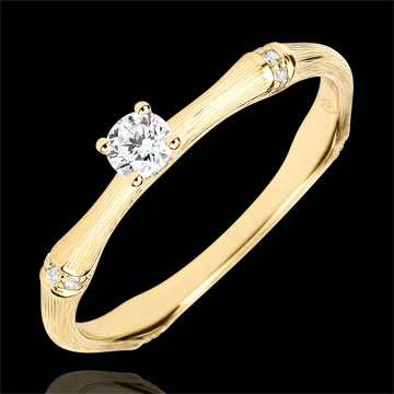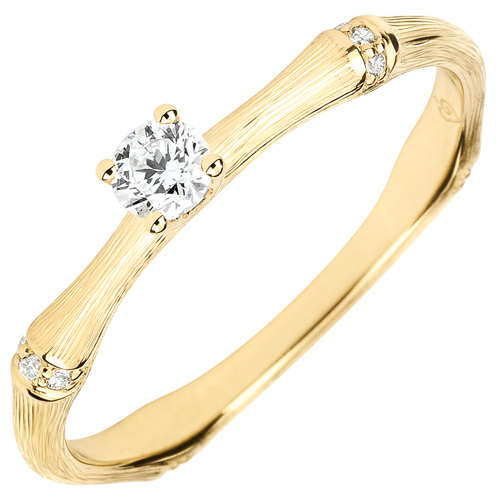 Een soepele en solide bamboetak geeft nu vorm aan een verlovingsring van geelgoud voor een eeuwigdurend band. De bamboeknopen zijn ingelegd met diamanten in het geel geborstelde goud om de solitairee diamant subliem laten uit te komen De afwerking met de hand van de matte afwerking geeft een natuurlijke uitstraling aan deze realistische uitvoering.