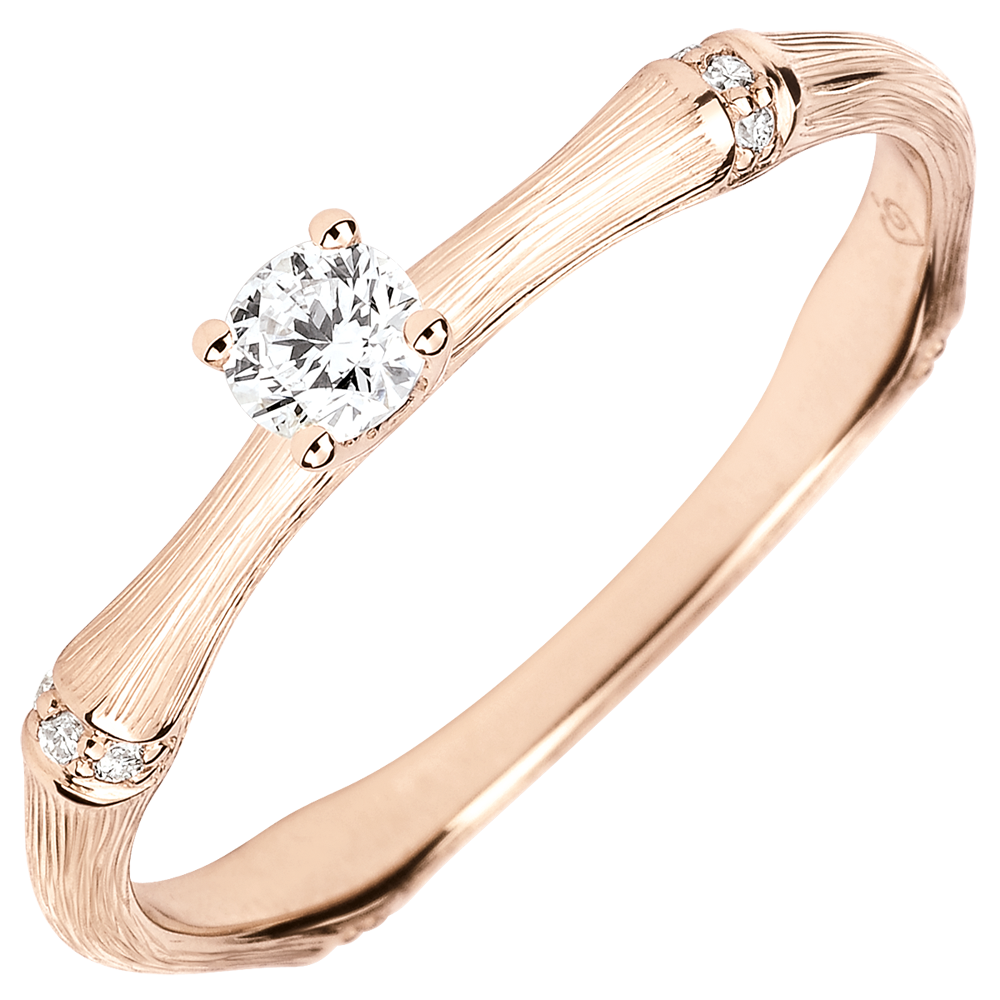 Een soepele en solide bamboetak geeft nu vorm aan een verlovingsring van roségoud voor een eeuwigdurend band. De bamboeknopen zijn ingelegd met diamanten in het roze geborstelde goud om de solitairee diamant subliem laten uit te komen De afwerking met de hand van de matte afwerking geeft een natuurlijke uitstraling aan deze realistische uitvoering.