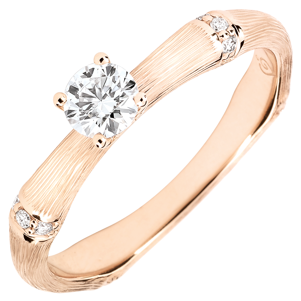 Een soepele en solide bamboetak geeft nu vorm aan een verlovingsring van roségoud voor een eeuwigdurend band. De bamboeknopen zijn ingelegd met diamanten in het roze geborstelde goud om de solitairee diamant subliem laten uit te komen De afwerking met de hand van de matte afwerking geeft een natuurlijke uitstraling aan deze realistische uitvoering.