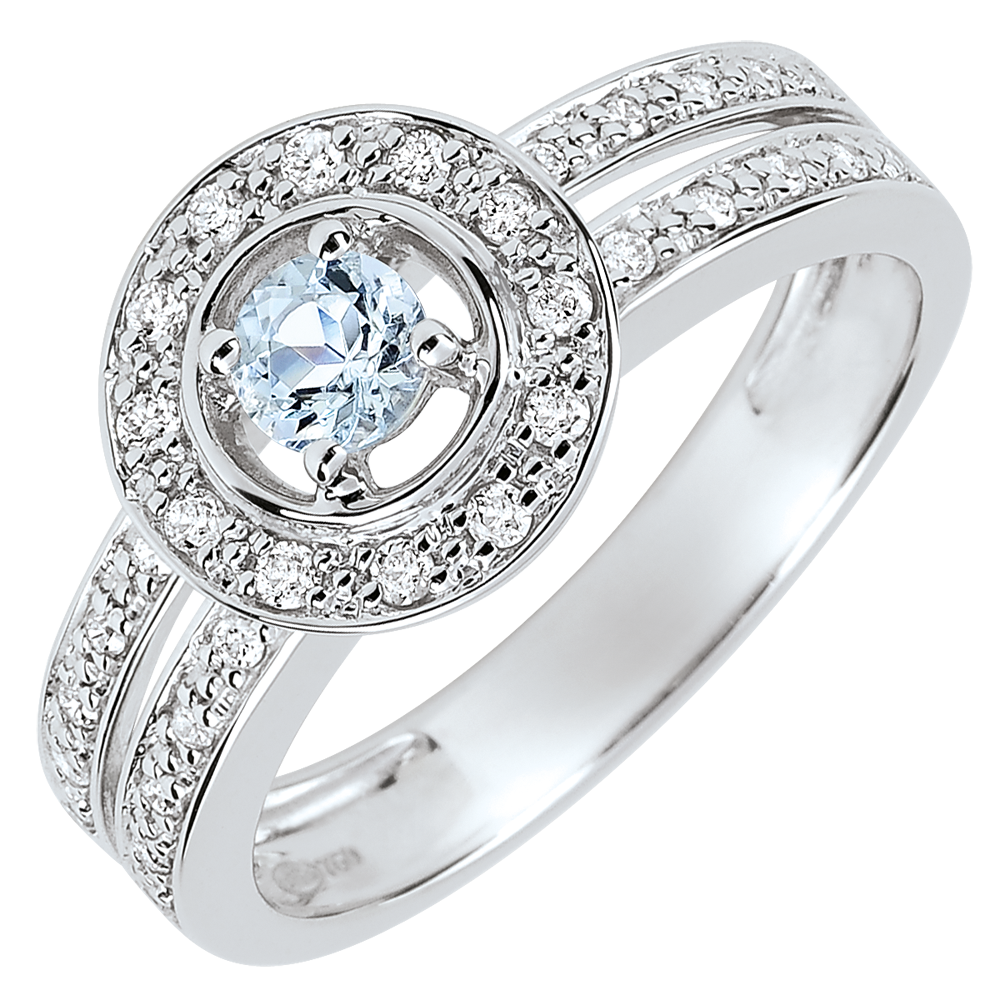De centrale aquamarijn wordt omringd met briljanten. Een dubbele ring, bezet met diamanten, tilt deze verlovingsring in witgoud met brio naar een bijzondere hoogte.