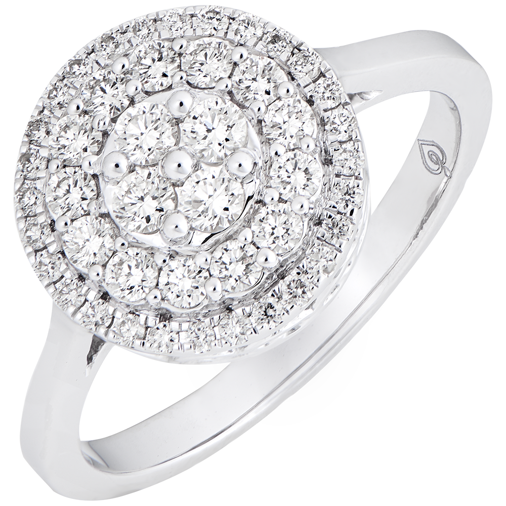 Een opgewerkte zetting met een concentrische bezetting van diamanten in de vorm van een romantisch sieraad. Een schitterende halo voor een edele, elegante ring.