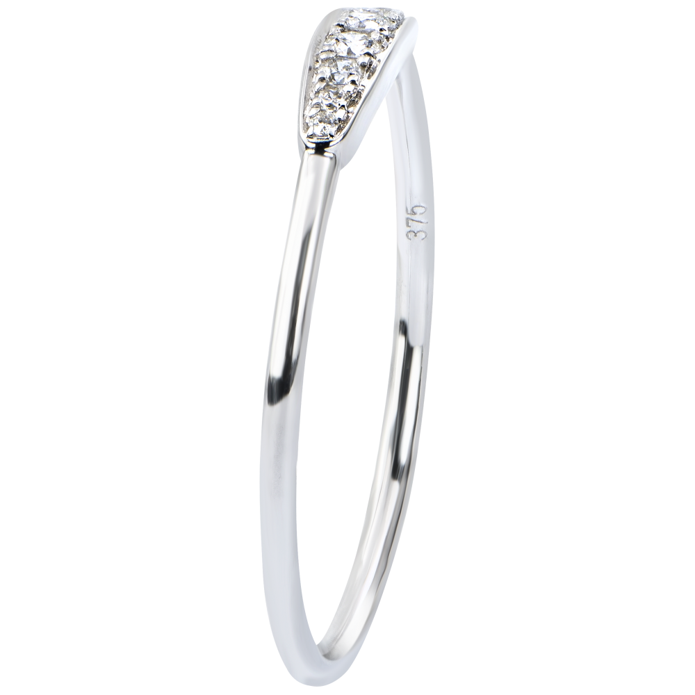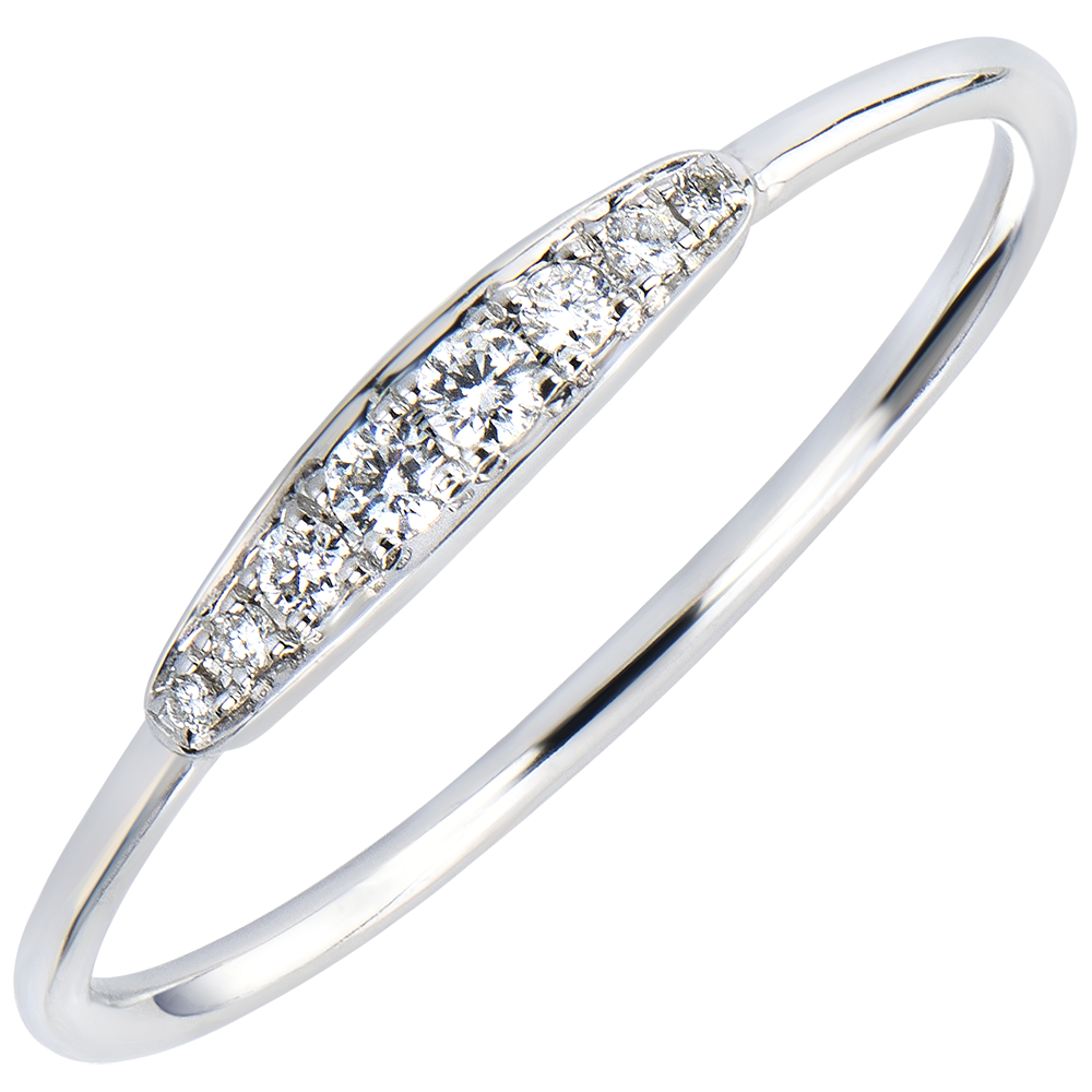Een jonge, eigentijdse ring met een minimalistisch design, geaccentueerd door een sobere en essentiële 8 diamanten pavézetting.