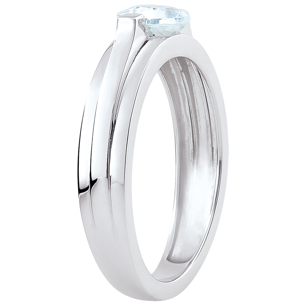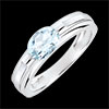 Deze verlovingsring in witgoud, modern en elegant, is voorzien van een Aquamarijn die rijkelijk opgesierd wordt door een dubbele ring