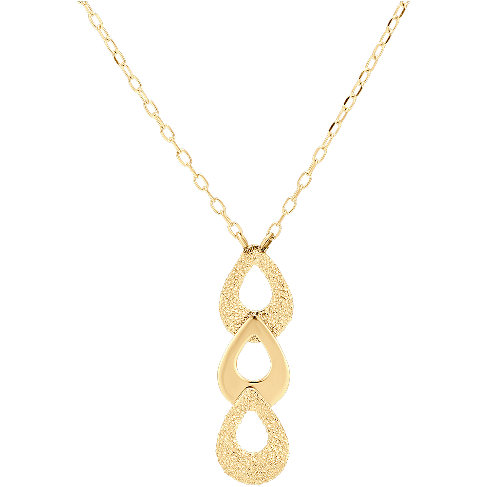 Een resoluut moderne geelgouden ketting. Versierd met een patroon van 3 samengevoegde peren, twee peren zijn van getextureerd goud - diamanteffect - en één is gepolijst. Verzekerde verliefdheid.