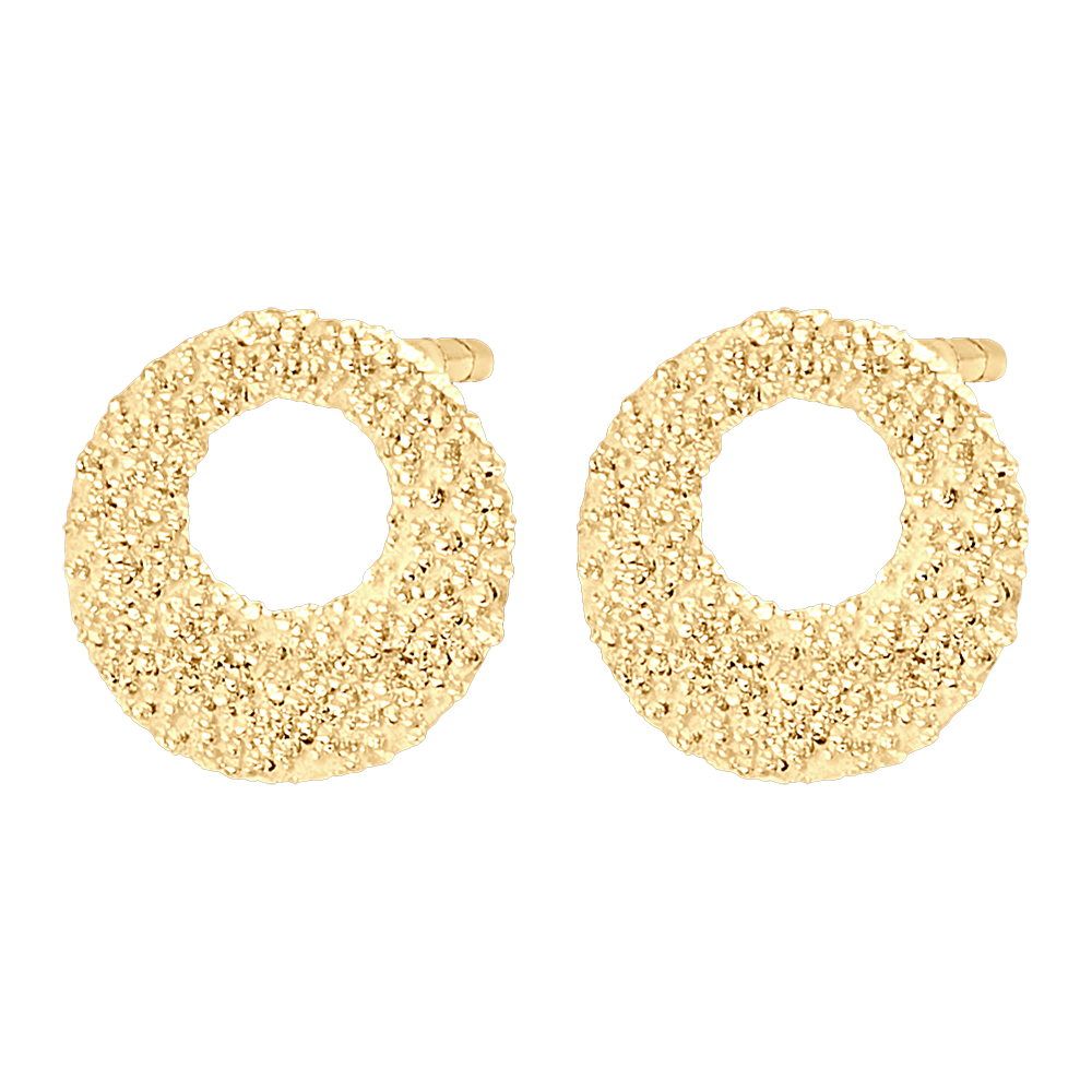 Een paar resoluut moderne geelgouden oorknopjes. Versierd met een cirkel van getextureerd goud - diamanteffect. Verzekerde verliefdheid