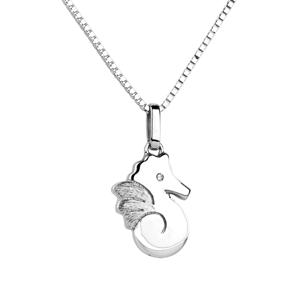 Een klein zeepaardje in witgoud is versierd met een diamanten oog. Groot model.